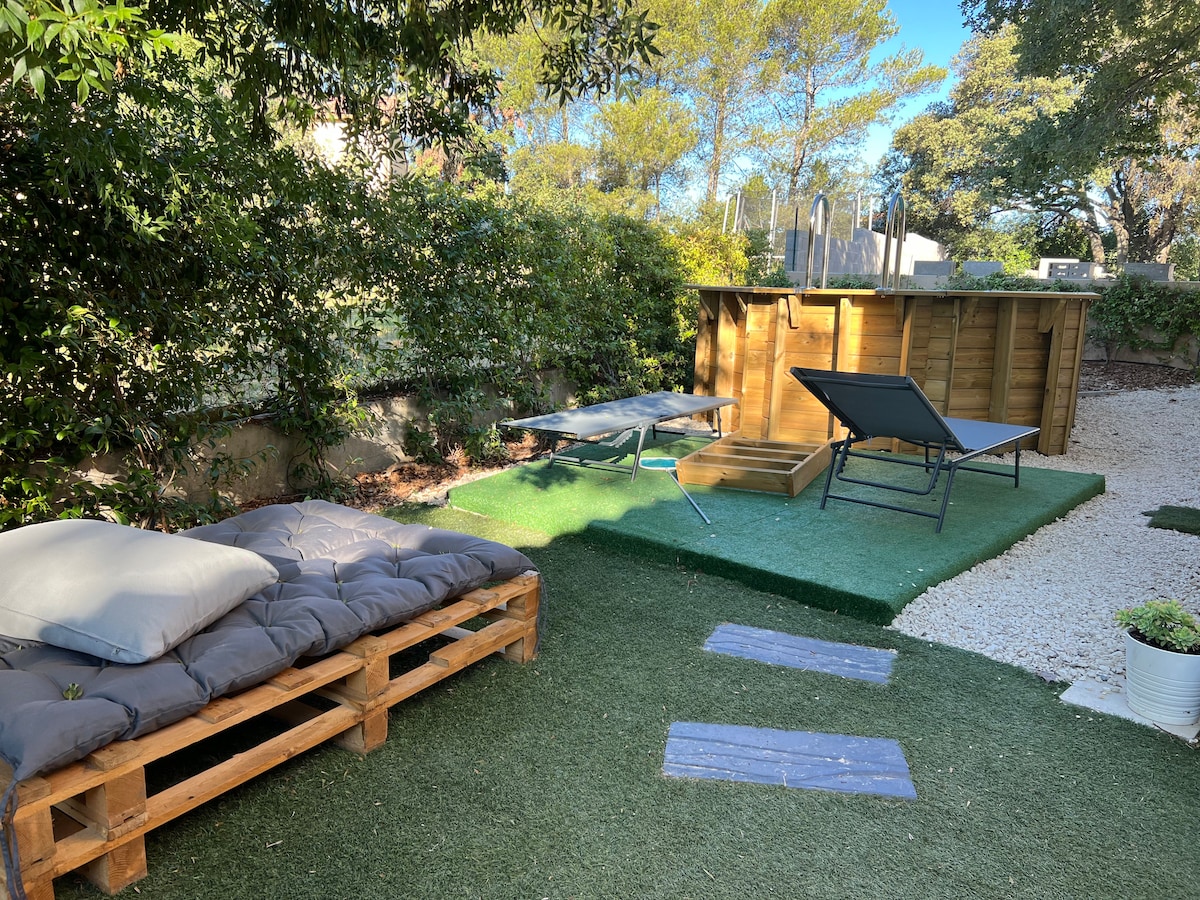 Dépendance 27m2 , facon suite parentale à côté de notre villa. piscine en partage avec la maison. Entree privee pas de mur mitoyen avec la villa Une terrasse avec table sous la pergola vous est réservée. linge de lit mis à votre disposition . Ce n’est pas un studio, donc il n y a pas de vraie cuisine ni evier. Cependant l’espace au fond est équipé d’un frigo/ congelateur, micro onde , machine à café, grille pain, vaisselle. Sucre, thé, capsules café à disposition.