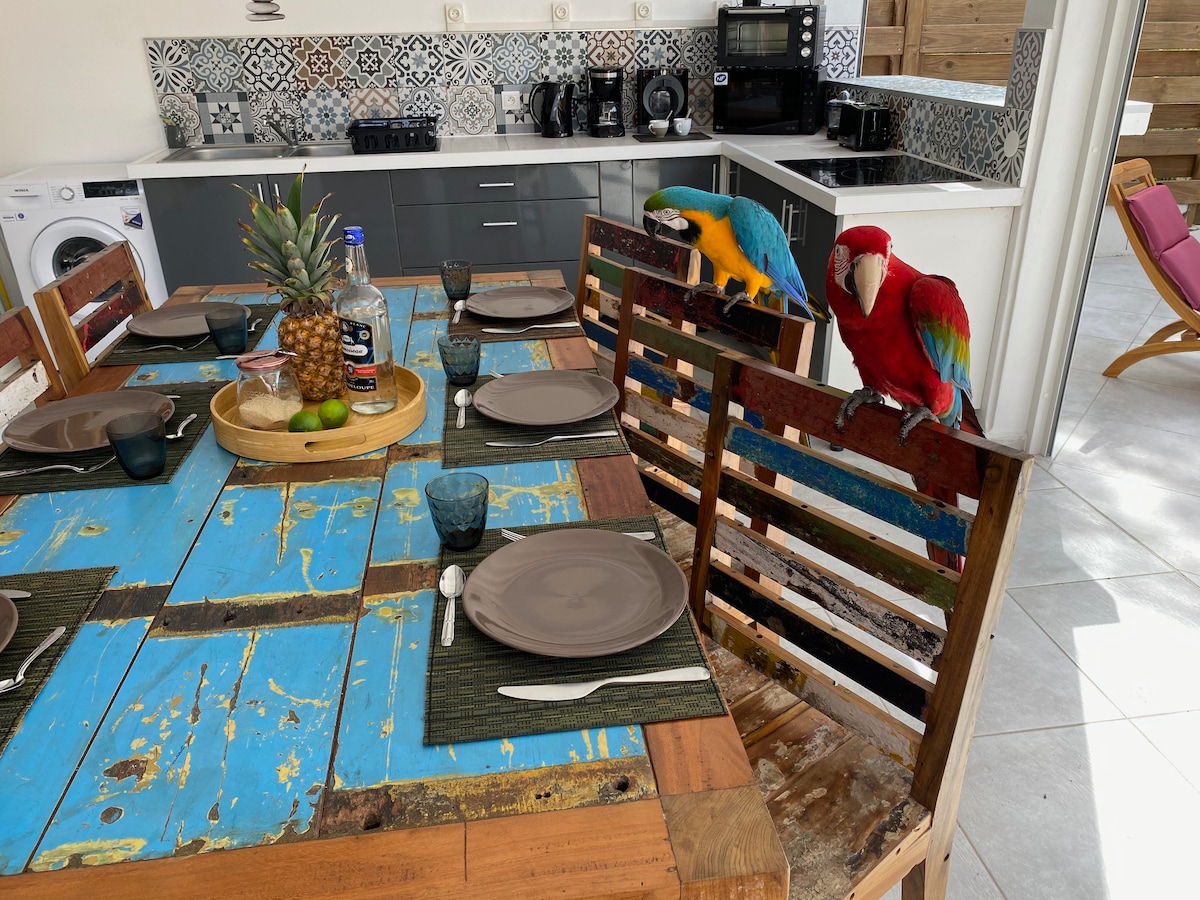 Jolie petite maison au cœur d'un jardin tropical équipée d'une chambre avec literie de qualité hôtellerie. La terrasse couverte vous permettra de profiter des chaudes soirées, la cuisine est équipée du nécessaire à votre confort la salle de bain avec douche à l'italienne vous permettra un confort idéal le logement est à proximité du centre de Saint-François et de la plage alex cuisinier de profession vous propose une table d'hôte le premier petit-déjeuner vous sera offert par vos hôtes.