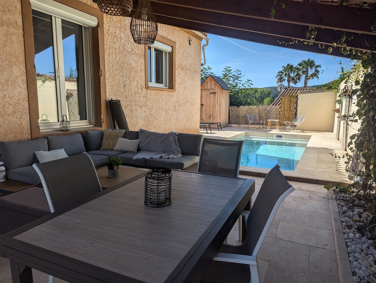 Casa de 42 m² con jardín privado de 100 m² y 2 terrazas con horno para PIZZA. Una piscina privada climatizada de 10 m² con vistas a la terraza está reservada para usted en el terreno (sin restricciones de horario para su uso), un jardín mediterráneo está presente con palmera, cocotero, limonero, platanero y olivo. La casa tiene una cocina americana completa ( nevera, placa de inducción, hornos, lavavajillas, cafetera tassimo...), una mesa y 4 sillas.