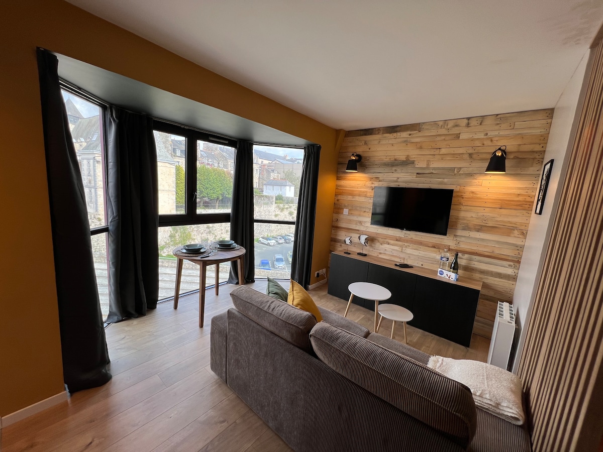 Très bel appartement agencé par un architecte au deuxième et dernier étage d'un bâtiment qui fut autrefois une brasserie prospère sur le port de Dinan. Tout le confort moderne à disposition, télé, WiFi, coin séjour, cuisine équipée ( lave-vaisselle, four, plaques vitrocéramiques, frigo, café Senséo, grille-pain, micro-ondes etc ...). Les lits sont faits, le ménage est inclus.Nombreux restaurants à deux pas, boulangerie, promenade à pied, bateau, vélo, petit train... Supplément 10€ si animal.