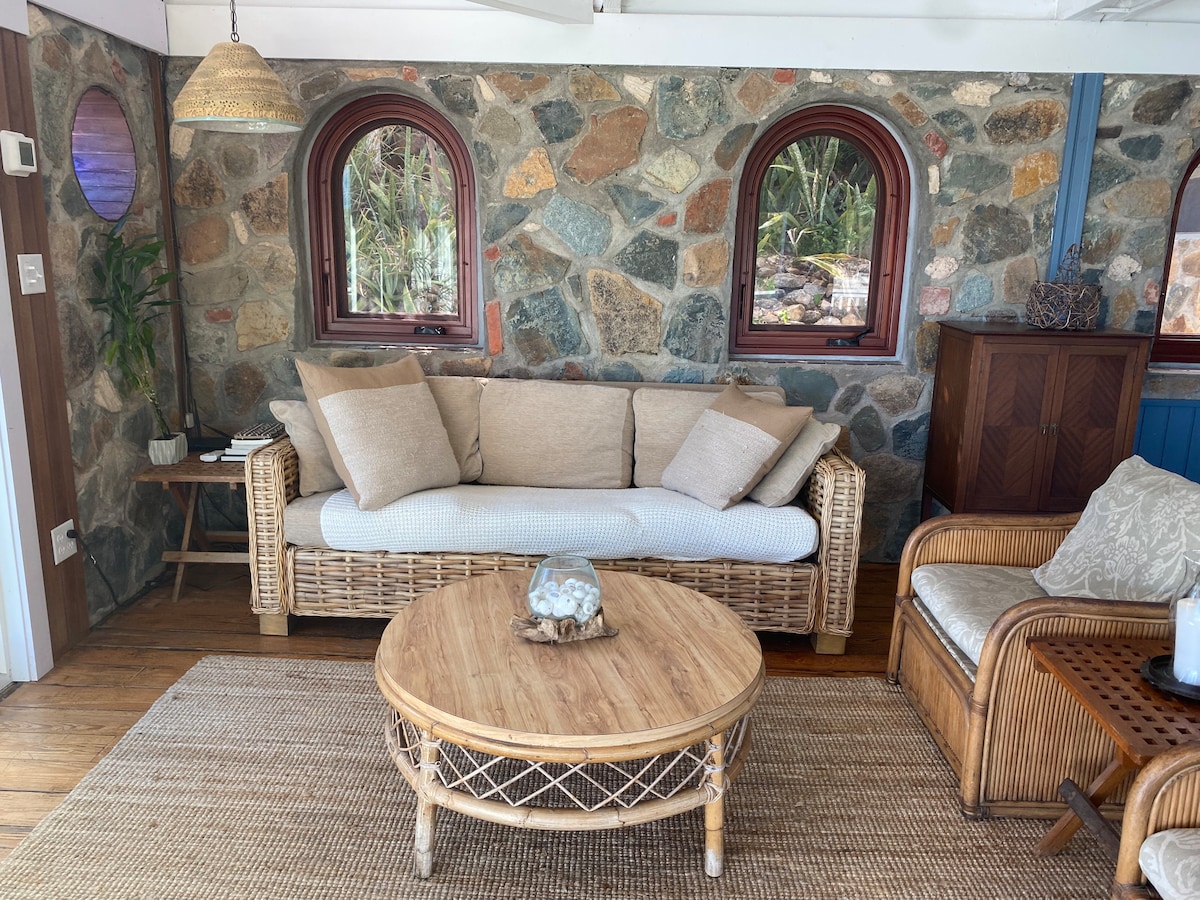 Preciosa casa de campo con 180 grados de vistas a las aguas blancas. Puedes ver y oír las olas rompiendo debajo. Aire acondicionado, privado, romántico con una hermosa ducha al aire libre. Acuéstate en un nido de intimidad. Sumérgete en las brisas de la isla. Disfruta de las vistas del sol naciente y la luna mientras brillan a través de las aguas cristalinas de Hurricane Hole. Adáptate al ritmo de la vida en la isla con energía solar y agua de lluvia purificada, recomendaciones ingeniosas, consejos y sugerencias de expertos. Bienvenido a la elegancia sencilla.