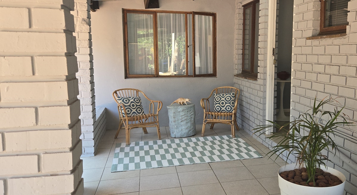 Apartamento rústico muy bien equipado con cocina americana en un entorno de jardín. Una casa antigua convertida en unidades separadas. A 6 pasos de la única puerta. Muchas ventanas, luz. Junto a la piscina y un sendero comunitario y barbacoa propia (braai) y muebles de jardín. Pequeño baño a través de la cocina (lavabo, inodoro y ducha). Cocina de gas. Solo ventiladores de techo. 1 dormitorio grande. Salón y comedor. Los electrodomésticos, muebles y decoración varían (artículos nuevos, viejos y hechos a mano). NO es moderno, pero es sencillo y funcional. No hay televisión.