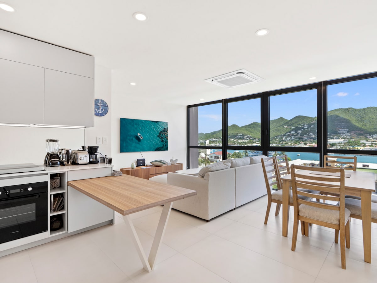 Despierta con la magnífica vista panorámica de la laguna en el último piso, rejuvenece tu cuerpo con un refrescante chapuzón en la piscina infinita privada de la azotea con un café o bebida tropical. Date un paseo de 10 minutos hasta la famosa playa de la bahía de Mullet y toma unos cuantos cruasanes franceses junto a la plaza. Después del atardecer, disfruta de los abundantes bares y restaurantes del vecindario o toma 5 minutos en coche hasta Maho, donde encontrarás una gran variedad de restaurantes, casinos y clubes o Porto Cupecoy para el lugar romántico.
