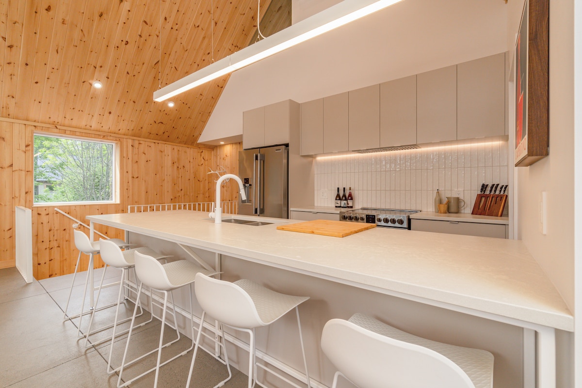 Acogedor chalet atemporal conceptualizado por los arquitectos de _naturehumaine. Ubicado en el acantilado a una altitud de 490 metros (1600 pies), su diseño único se distingue por la audacia y la originalidad y encaja con la armonía en su entorno. Rodeada de bosque, la cabaña ofrece vistas impresionantes del monte Glen y la naturaleza circundante, protegida en gran parte por el Corredor de los Apalaches. El lugar silencioso perfecto para relajarte y relajarte. Foto: Adrien Williams / S.A. CITQ #302449