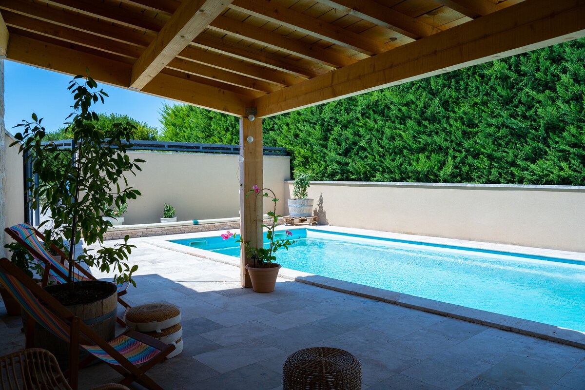 Relájese en este alojamiento tranquilo y elegante disfrutando de la piscina y el jacuzzi privados. Su espacio privado sin vecinos está equipado con una cocina al aire libre. Un verdadero nido para pasar una estancia tranquila en la que solo tendrás que disfrutar del canto de los pájaros.