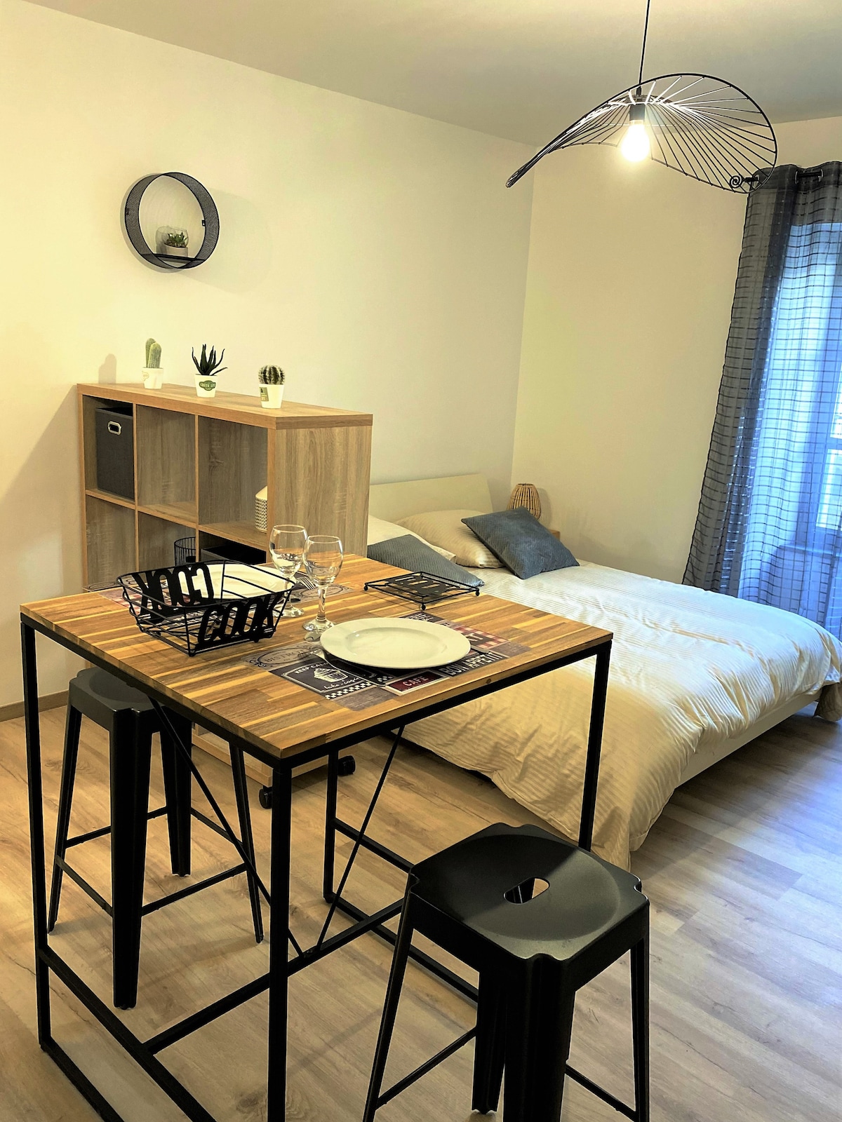 Très bel appartement moderne avec garage privé ,climatisé centre ville proche commerces,restaurants ,centre historique, 40 m2 au 3 ème et dernier étage(sans ascenseur). Cuisine entièrement équipée(frigo,congélateur,lave vaisselle,plaque induction,four,micro onde,machine à café,lave linge,sèche linge) ouverte sur le salon avec rangements , coin bureau ,TV,une chambre indépendante(lit 160) avec dressing,salle de douche avec wc.Linge de lit et serviettes de toilette fournis.