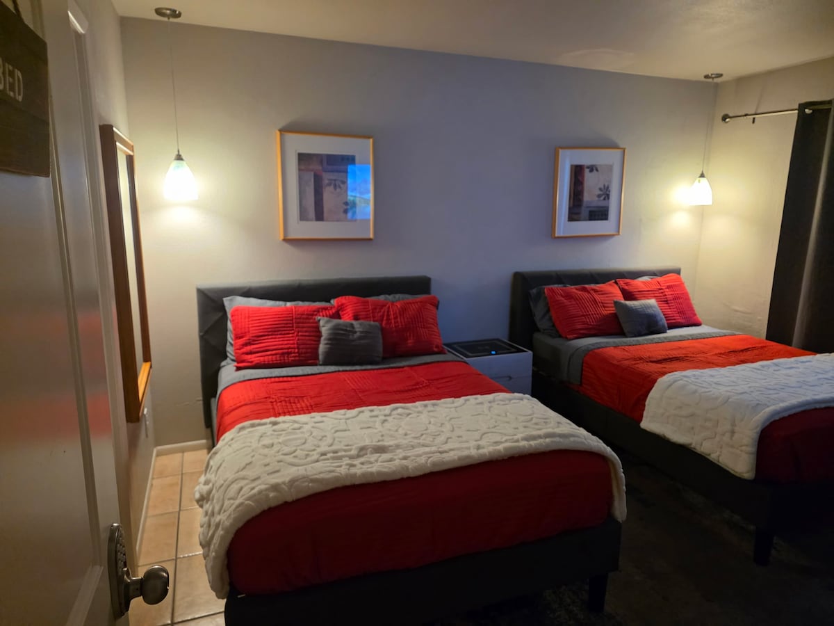 A minutos de las atracciones de Phoenix/Scottsdale. A 10 minutos del aeropuerto. El patio trasero tiene césped para tus hijos/perro. Solo está vallado en 3 lados. 2 casas en esta propiedad. Tu casa privada tiene wifi de alta velocidad. Canales premium gratuitos. TV de 50" en los dormitorios y una pantalla de cine de 10 pies en la habitación principal. Cocina totalmente equipada con agua RO. Lavadora/secadora. Ambas casas comparten patio con parrilla, fogata, spa, gimnasio en el lugar, cinta de correr, bicicleta estática, pesas, ¡Pregúntanos por nuestros autos de alquiler para completar tus vacaciones!