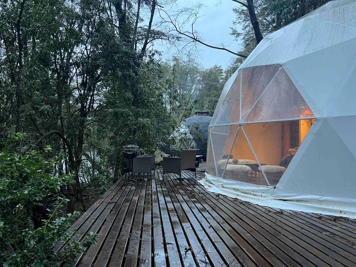 Parque privado. 7 metros de altura, Duplex para dos. Terrazas panorámicas al infinito y una pasarela colgante para volar. Aislación térmica, ventanas de termopanel, losa radiante y estufa de combustión lenta. Cama king size. Escritorio, WiFi, Cocina con refrigerador, encimera de inducción y los implementos necesarios para amenizar la estadía. Baño completo, ducha lluvia, toallas, secador de pelo, bidet. Fogón, parrilla y estacionamiento techado. A 6 kilómetros de Pucón por ruta pavimentada.