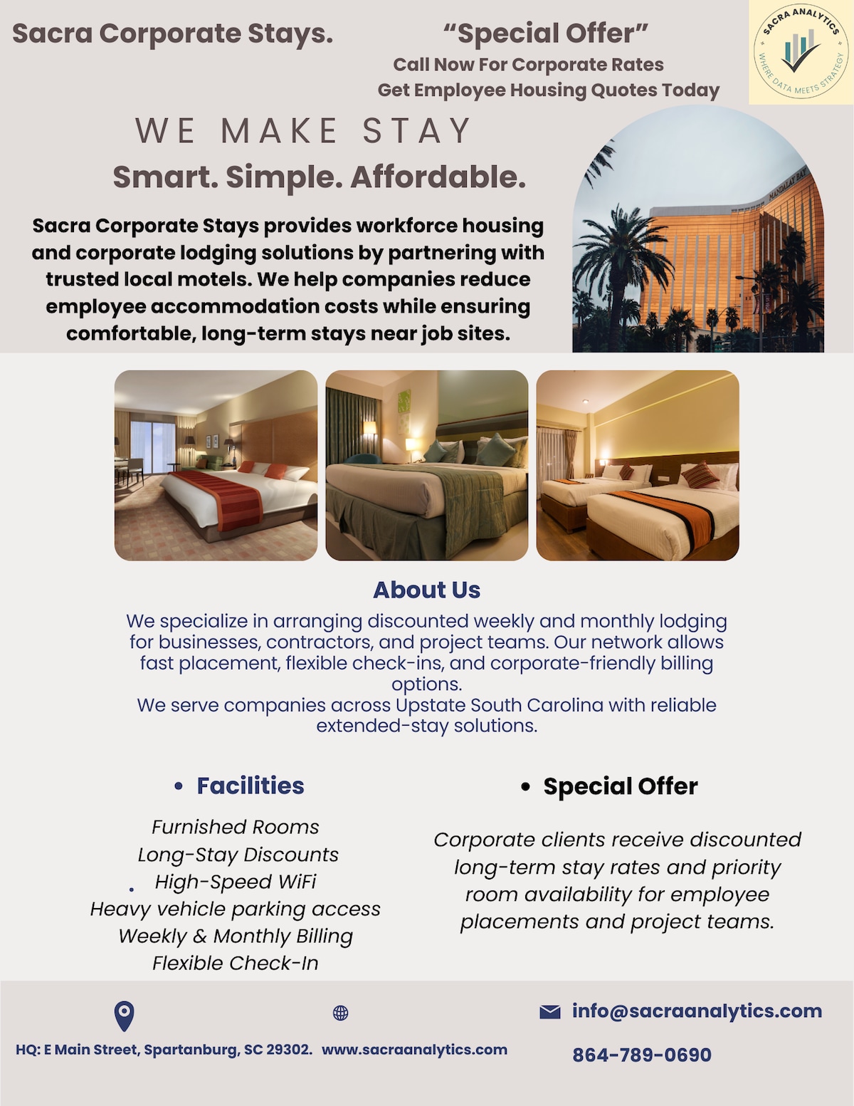Sacra Corporate Stays in Spartanburg, SC offers clean, affordable weekly and monthly accommodations ideal for construction crews, traveling professionals, and students. Each private motel room includes a secure entrance, furnished bedroom, private bathroom, and in-room kitchen to help you save on meals. High-speed WiFi and large truck-friendly parking available. Flexible check-in and long-term discounts offered.
