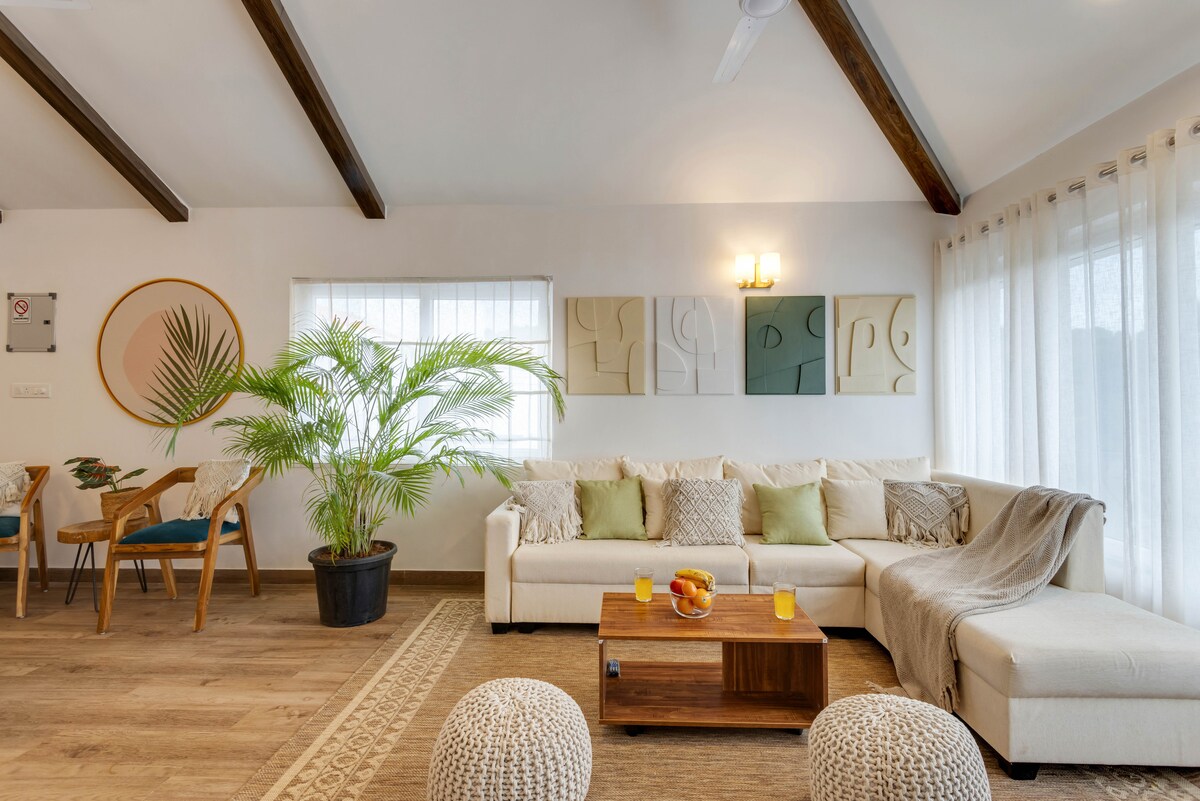 El Rosario 01 by The Blue Kite is a serene 2BHK is located on ground-floor apartment in Nerul with elegant modern interiors, a private garden with a hammock, and access to a common pool within a gated community. It features a spacious living room, a fully equipped kitchen, and two bedrooms with attached washrooms ideal for families or groups of friends. Coco Beach is just a 10-minute drive away, while popular restaurants like The Lazy Goose 10 min, The Burger Factory 6 min.
