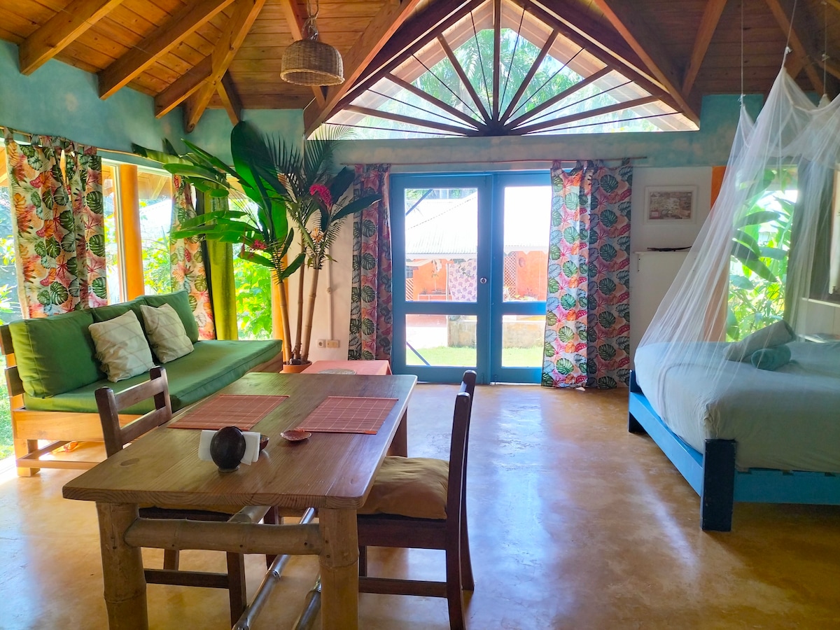 Fully renovated Caribbean-style bungalow/studio in a large, enchanting tropical garden filled with palm trees, tropical fruit & rainforest vegetation. Enjoy the garden, relax, practice yoga or pick fruit. Nature lovers will love this place! Only a few minutes drive from the center of the town & beaches, but yet in a peaceful garden, away from the crowds and busy traffic. Nearby beaches Playa Bonita & Coson are often listed among the best ones in the whole Caribbean! 1 minute from bus drop off.