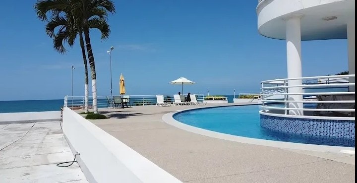 Un departamento grande, en el primer piso del edificio (no en la plata baja), cómodo, espacioso, con mucha luz natural, ventiladores, cocina, 3 salas, hamaca, comedor, 3 dormitorios y 2 baños completos, un baño para. visitas. Está dentro de un conjunto cerrado y privado, con guardiana 24hrs, piscina, área de juegos, jardín espacioso, con la playa en frente: cerca del hotel y las zonas de esparcimiento social y restaurantes; y cerca del muelle. *Incluye toldo para la playa con sillas!