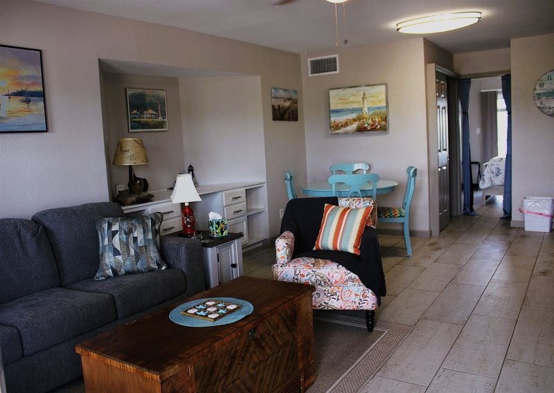 Updated condo with a new kitchenette and a full bathroom - prefect for short or long-term stays! The building has a lobby with an attended front desk, along w/ pool and hot tub, laundry, and 1000 ft fishing pier private to guests. Short distance to downtown Art District and where all the lively action goes down! Just bring a toothbrush and move right in! The staff are amazing, friendly neighbors and clean amenities. Activities and restaurant recommendations available.