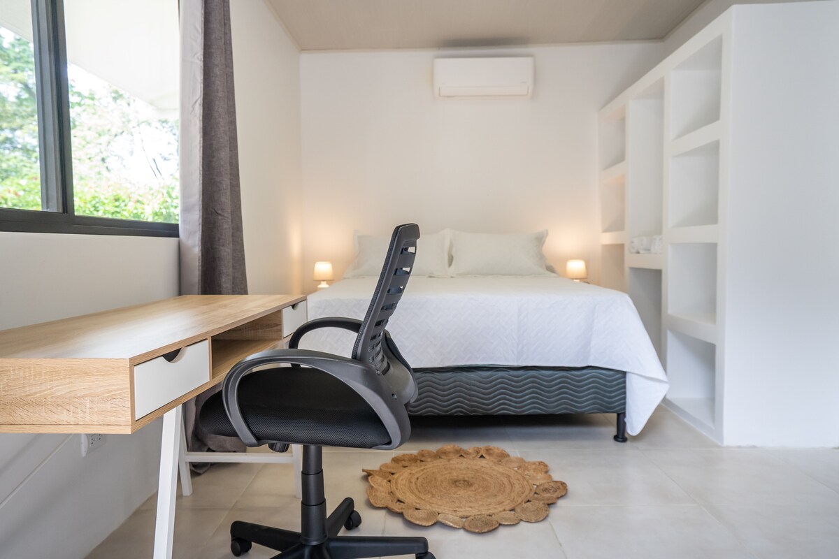 Disfruta de este alojamiento tranquilo y céntrico con piscina compartida. Cocina equipada con todo lo necesario para cortas y largas estancias. Internet de alta velocidad 100Mbs con zona de trabajo. Smart TV con cuenta de Netflix incluido. Parking privado cubierto con cámaras de vigilancia. Excelente ubicación céntrica y a poca distancia andando de tiendas y restaurantes. Está a 5 minutos en coche del Parque Nacional Marino Ballena, de la playa, y de rutas hacia la selva y las cascadas.