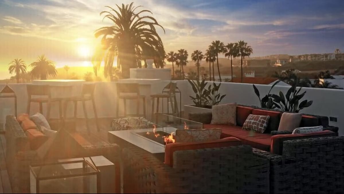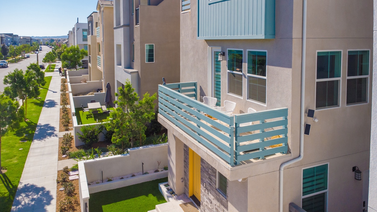 Brand new 1700sq.ft townhouse has a 600 sq.ft+private roof top deck with ocean view and fireplace. 10 min.walk to beach.San Clemente's best restaurants and shopping 2 blocks away. Memory foam beds, gourmet kitchen, high-end dining and living room , fireplace , 70" t.v. Twin over full bunk bedroom, murphy queen bedroom/office master w/ king, balcony. 2.5 baths, washer/dryer , indoor parking. All new in 2021. An oasis in an ideal location. Top 5% of all Airbnb listings for a reason! We b good!!!