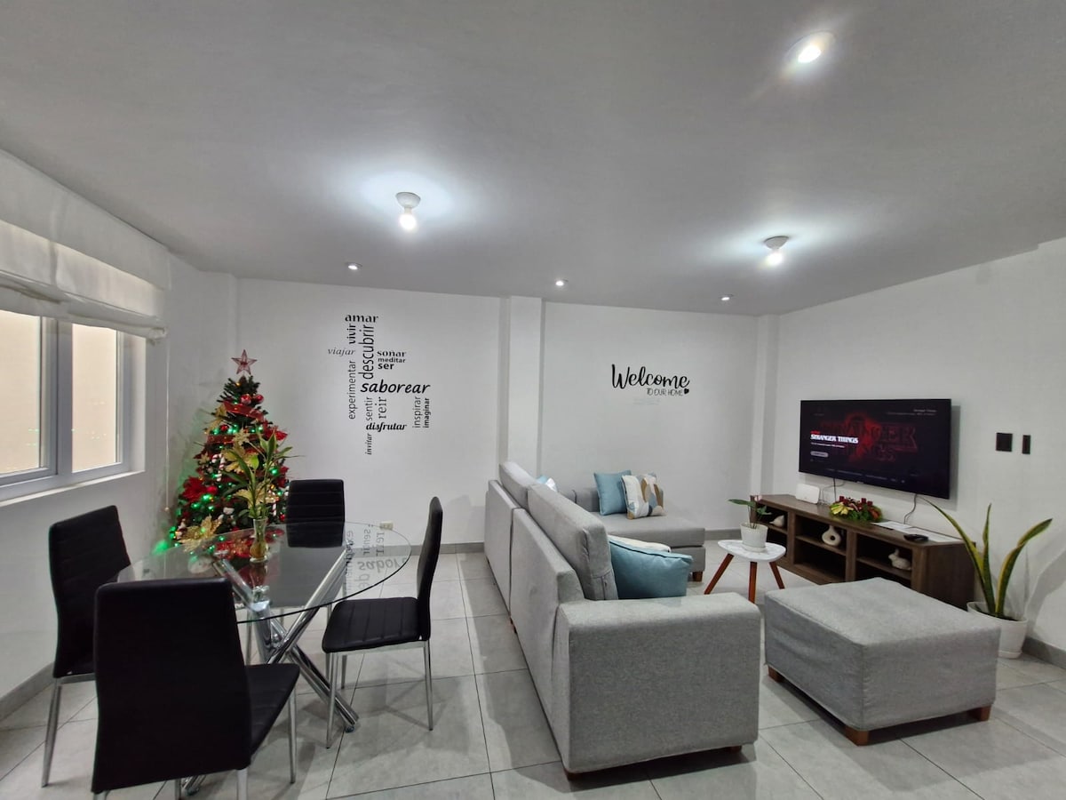 Si deseas sentirte como en casa y disfrutar de estancias agradables en un lugar ubicado a 15 minutos del aeropuerto. Mi Dpto. es espacioso, privado, con todas las comodidades y de uso exclusivo para una o dos personas. Cuenta con sala, comedor, cocina, lavandería, una habitación con cama dos plazas, y dos baños. La cocina está completamente equipada y existe un minibar. Cuento con Wi-fi y Netflix ideal para tus momentos de descanso. Además a 5 minutos hay un centro comercial.