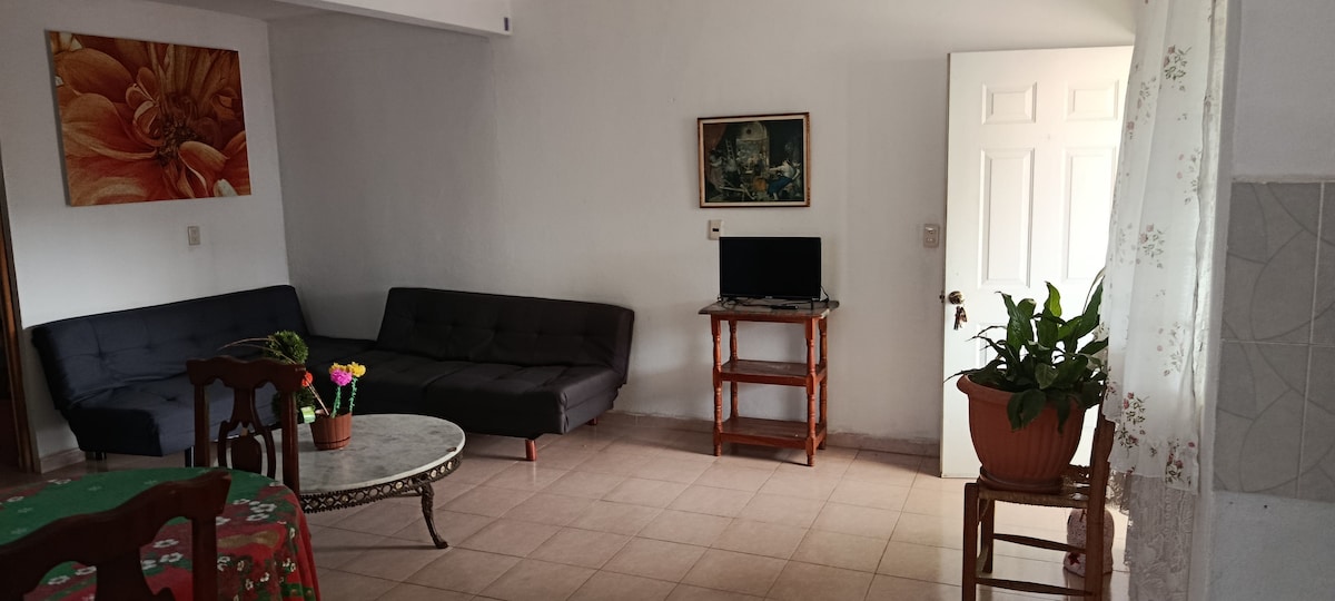 El hospedaje se encuentra en el primer piso, cuenta con una recamara con dos camas matrimoniales ,plancha burro de planchar, pantalla,una cajonera un pequeño tocador un buró,como decoracion una pintura al óleo y una lámpara artesanal. Aparte cuenta con un espacio que se utiliza como sala comedor y cocina. La cocina tiene horno de microondas, refrigerador, cafetera,licuadora, parrilla y utensilios necesarios para cocinar. Una ventana que da a la calle y un bañó completo