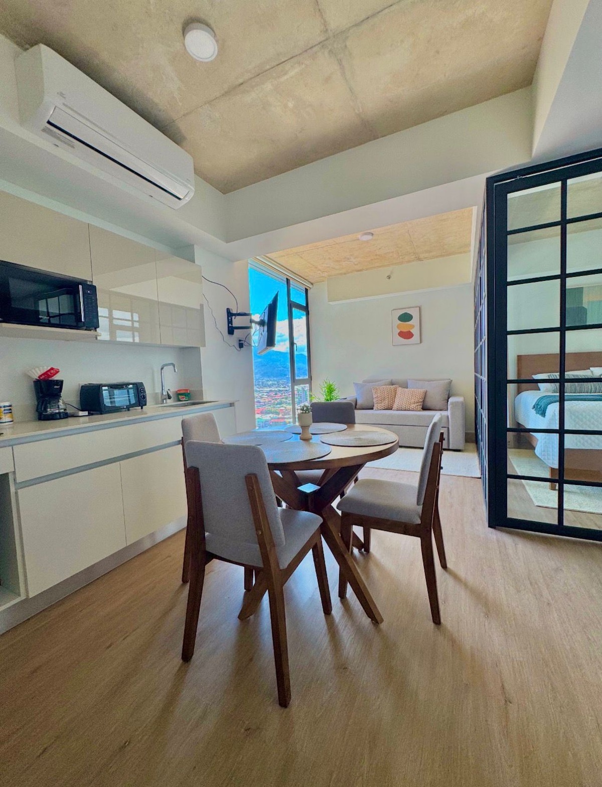 Disfruta de la tranquilidad de este smart loft, elegante y céntrico con vista a la ciudad! Ideal para relajarse. Cuenta con todos los servicios necesarios para hacer de tu estadía la más agradable con la más alta calidad. Su ubicación es favorable ya que se encuentra cerca de restaurantes, centros comerciales y supermercados. Está a solo 15 min del casco central de San José. Cuenta con una gran cantidad de amenidades como piscina temperada, cine, sala de estudio, gimnasio y área de coworking.