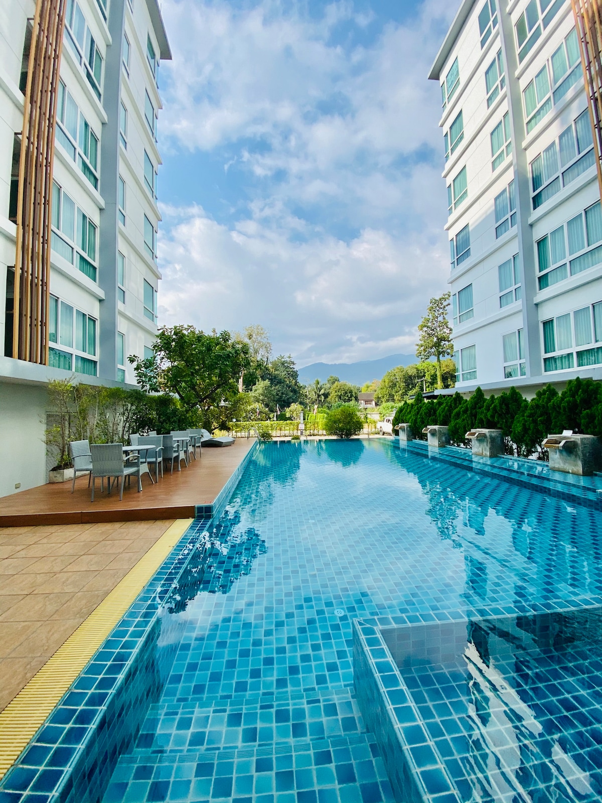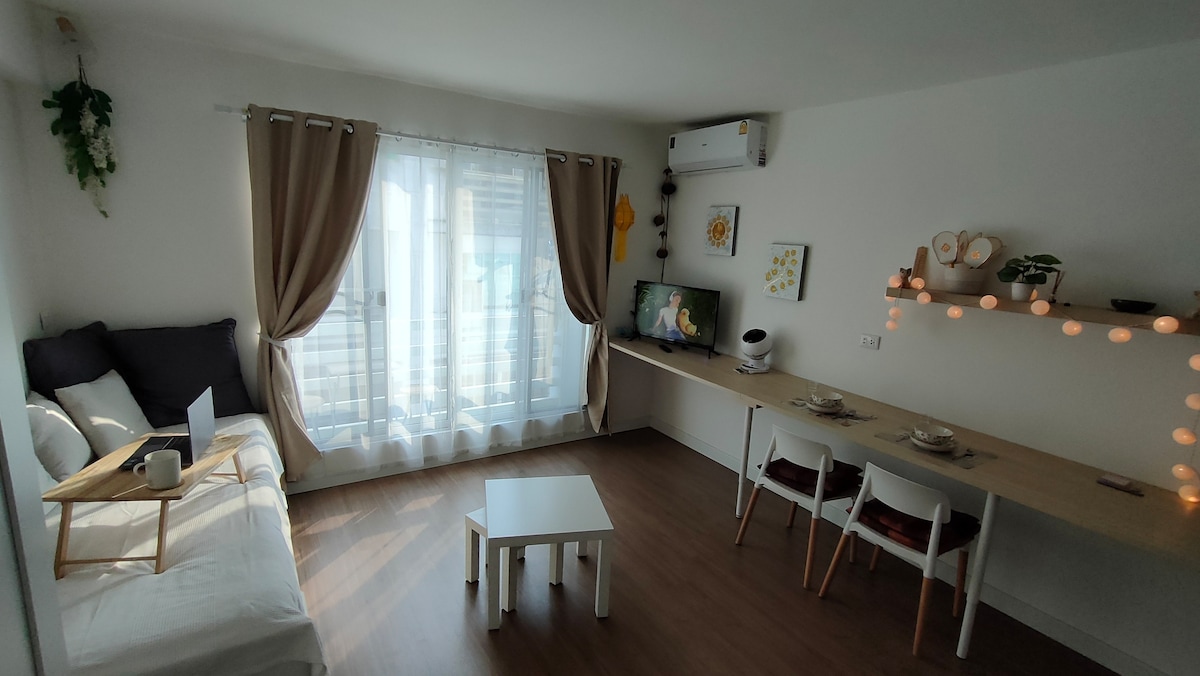 Apartamento de 49 metros cuadrados con cocina, totalmente amueblado. Junto al monte Suthep. Dormitorio separado y sala de estar con bidé japonés. Es genial alojarse en una zona tranquila, bonita y local. Pueden alojarse 4 personas. 1 cama doble en el dormitorio. 1 sofá cama en el salón (se configura como cama cuando se reserva para 4 huéspedes). 10 %dde descuento por semana y 25 %dpor mes. Instalaciones (gratuitas): onsen, piscina, gimnasio, sauna y aparcamiento. Cafeterías y restaurantes alrededor. 7-11 está a aproximadamente 1 km. Desde la carretera Nimman hay 4 km.