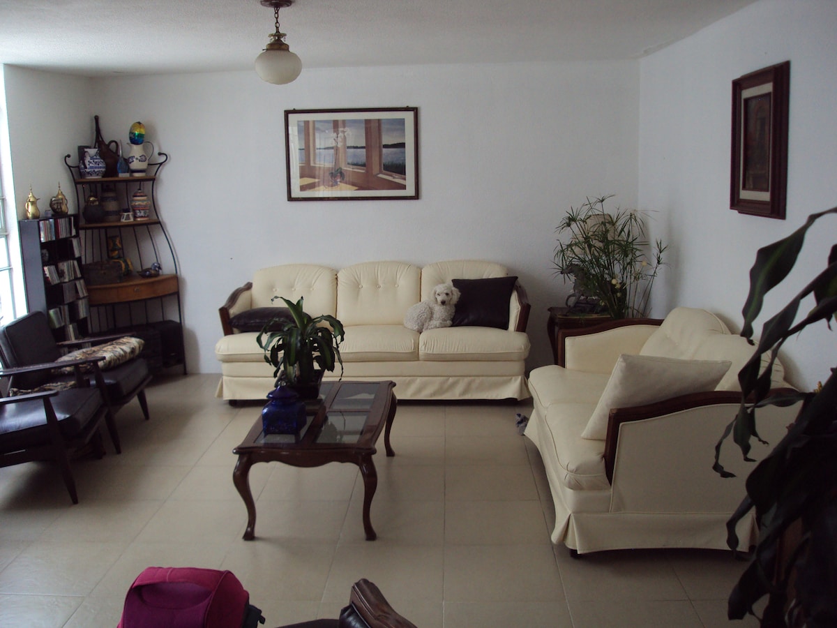 este cómodo departamento es para relajarte tal vez después de un arduo día de trabajo en zona 2000, periférico o de una madrugada de fiesta en la Hacienda San Juan Bautista. Ubicado menos de 20min del centro histórico, 10min de Chachapa a 5min de flor del bosque. Y a pasos del cerro de Amalucan! carne asada, ejercicio y naturaleza envolvente. Un espacio perfecto fuera de la abrumadora ciudad