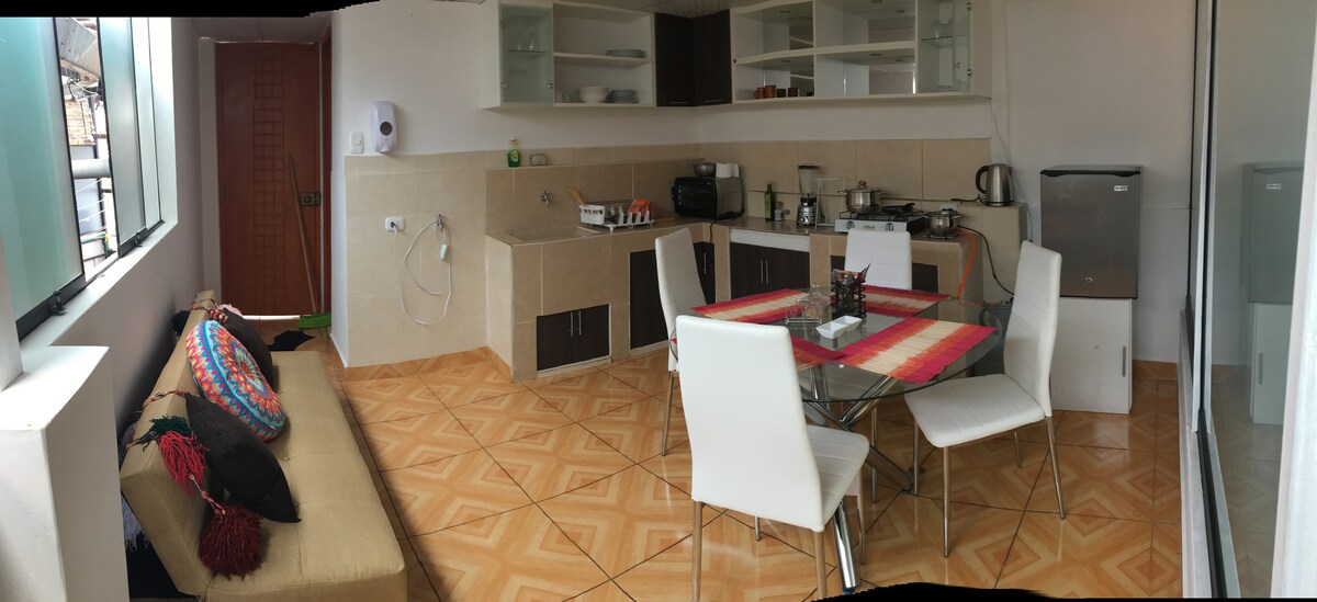Acogedor mini departamento completamente amoblado,excelente ubicación, a 5 minutos de la plaza de armas, cuenta con un cuarto amplio, una sala comedor, un baño, una cocina equipada y una terraza. Niños menores de 5 años no pagan. Nosotros vivimos al costado para cualquier cosa que puedan necesitar, por esto mismo a veces se puede escuchar a nuestros perritos ladrar, esto solo sucede eventualmente y no durante las noches. No contamos con calefaccion instalada pero tenemos un calefactor grande para alquilar, el costo es de 10 soles la noche.