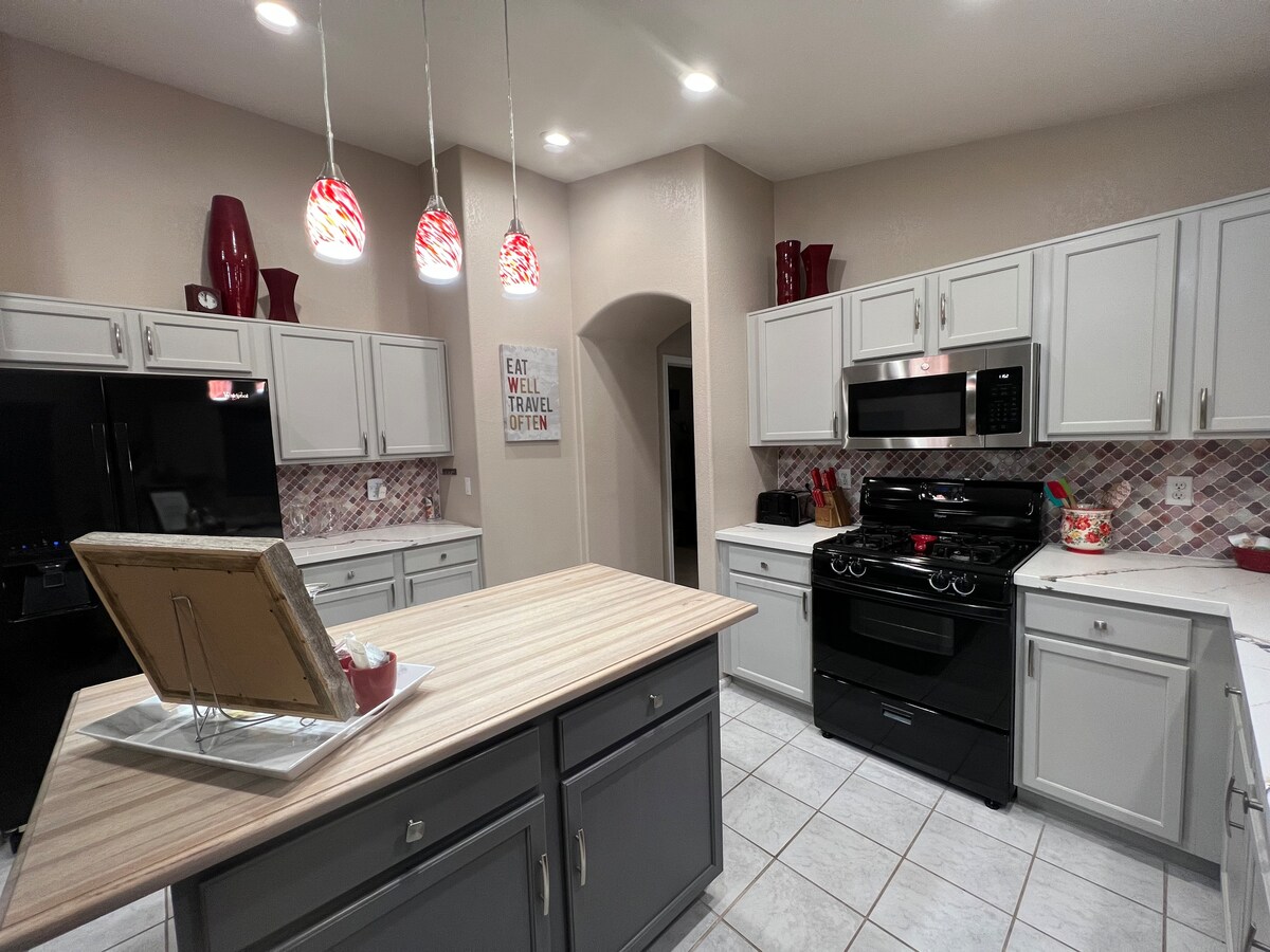 Bonita escapada a la soleada Arizona. Lo suficientemente cerca de Phoenix y de todos los negocios de la ciudad, pero lo suficientemente lejos como para obtener la tranquilidad y la relajación que deseas y necesitas. Nuestra casa está ubicada en una pequeña comunidad en San Tan Valley, parte del área de Queen Creek que está creciendo rápidamente. 3 dormitorios (más una habitación adicional con escritorio y cama/2 baños). La sala de estar delantera tiene una cama extraíble. La sala de estar tiene un gran sofá modular y ¡no se puede superar el patio trasero! Nota: a 40 minutos de Sky Harbor, a 15 minutos de Mesa Gateway.