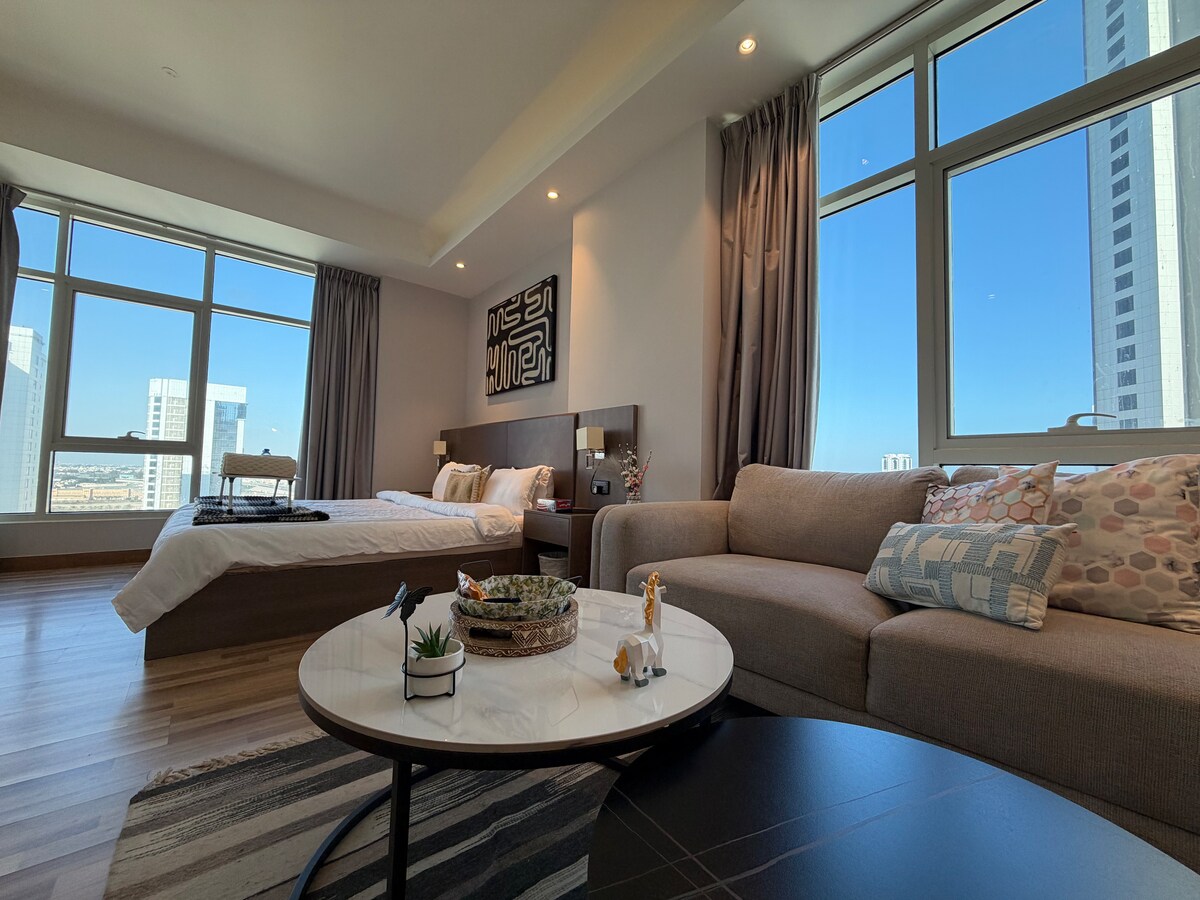 Entra en el lujo en este hermoso apartamento en la planta superior, donde la elegancia moderna se encuentra con la comodidad. La espaciosa distribución incluye una elegante cocina, una sala de estar luminosa y una generosa cama . Disfruta de la paz y la tranquilidad que conlleva estar en un piso más alto, junto con unas vistas impresionantes. Ubicado en el centro de Bahréin, estás a solo un minuto del centro comercial de la ciudad y a 2 minutos del centro comercial Seef y de los mejores hoteles, donde hay tiendas, restaurantes y recreación. ¡Haz de este exquisito apartamento tu santuario hoy mismo!
