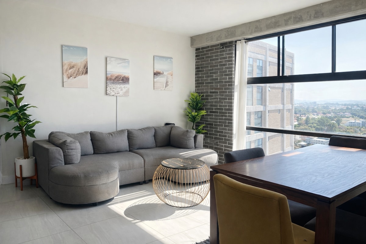 Lujoso y bonito apartamento con diseño art déco y muebles, relájate y disfruta de la vista porque está en un noveno piso, cuenta con comodidades como una pintoresca piscina, gimnasio, azotea panorámica, sala social, parrillas de barbacoa, seguridad y ascensores. El apartamento tiene una habitación con cama tamaño queen, un baño completo, lavandería, cocina completa, nevera con máquina de hielo y dispensador de agua fría. Ofrecemos 2 toallas para la ducha y 2 toallas para la alberca. También ofrecemos tours a la ciudad y pueblos mágicos.