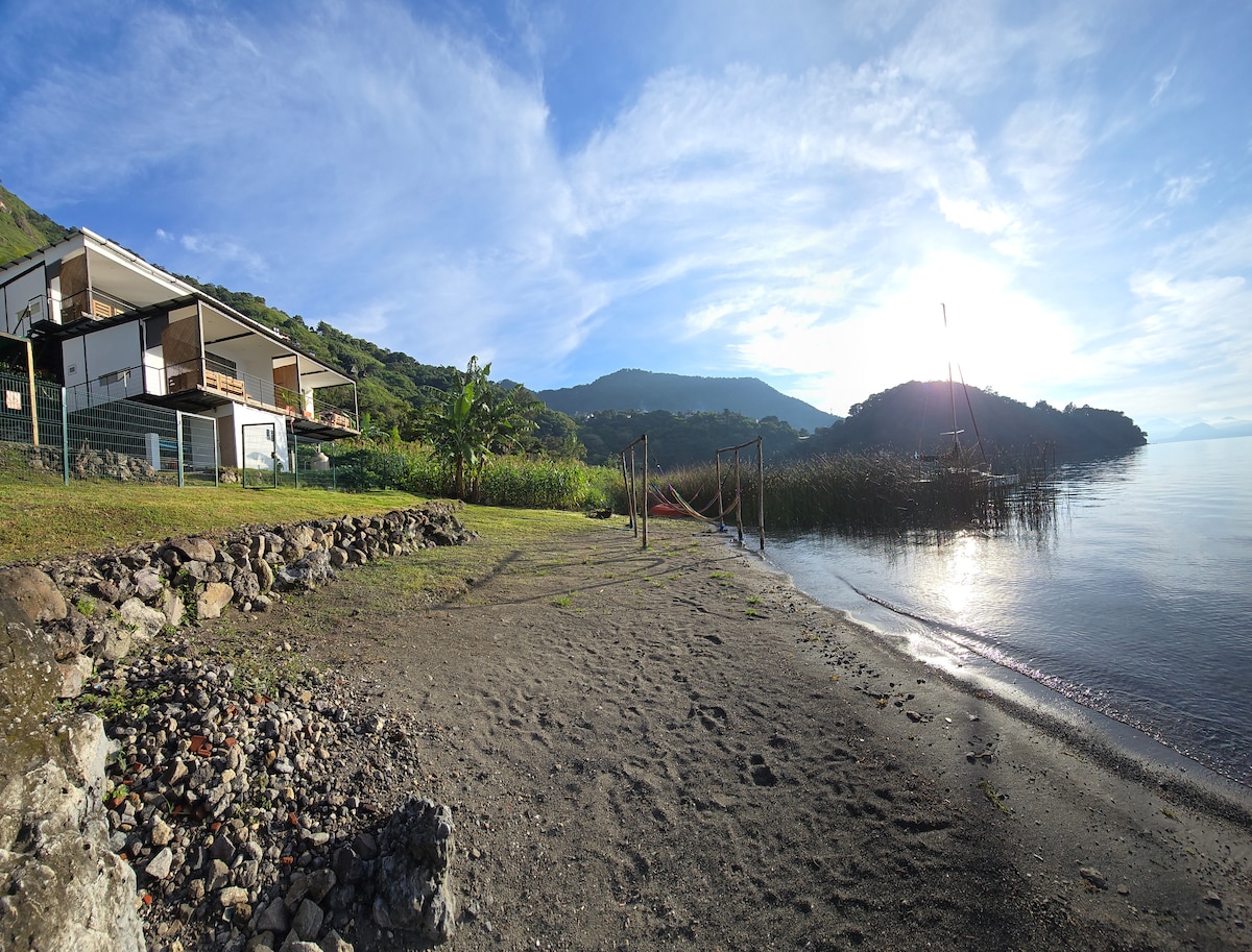 Moderna se encuentra con Maya, esta casa frente al lago, a 10 minutos en barco de Panajachel, es un lugar único. Dos dormitorios con puertas correderas a balcones con vistas al lago y a las montañas circundantes. Tipo loft en la planta baja con salón/comedor y cocina para compartir tiempo de calidad juntos mientras contemplas el lago. A poca distancia a pie de restaurantes para cenas con velas, kayak/subalquiler y caminatas a lo largo de senderos de montaña o la orilla del lago. Privado pero seguro y accesible. ¡Prepárate para una estadía encantadora!