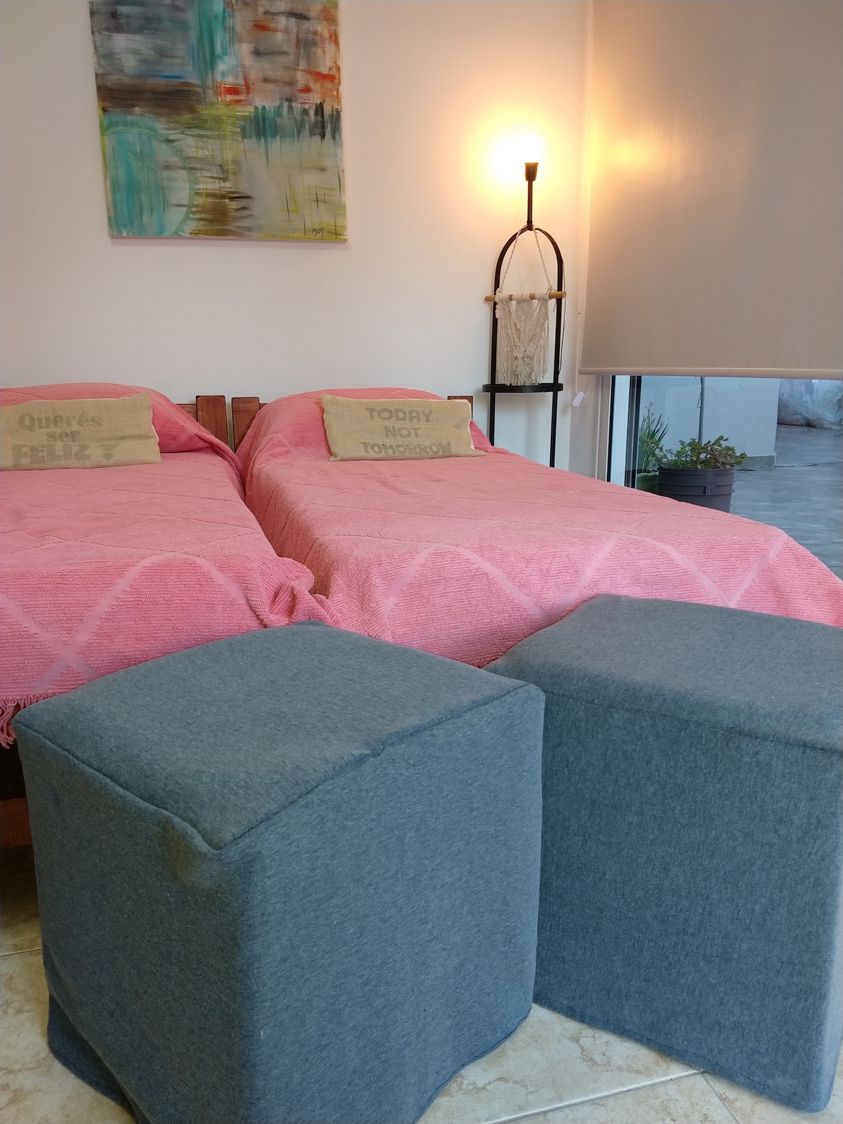 Monoambiente en el patio trasero compartido, con baño privado y a metros de la plaza principal y peaotonal. Con televisión, calefacción, heladera, microondas, pava eléctrica y tostadora. 2 camas individuales sommier que se pueden unir como cama matrimonial.