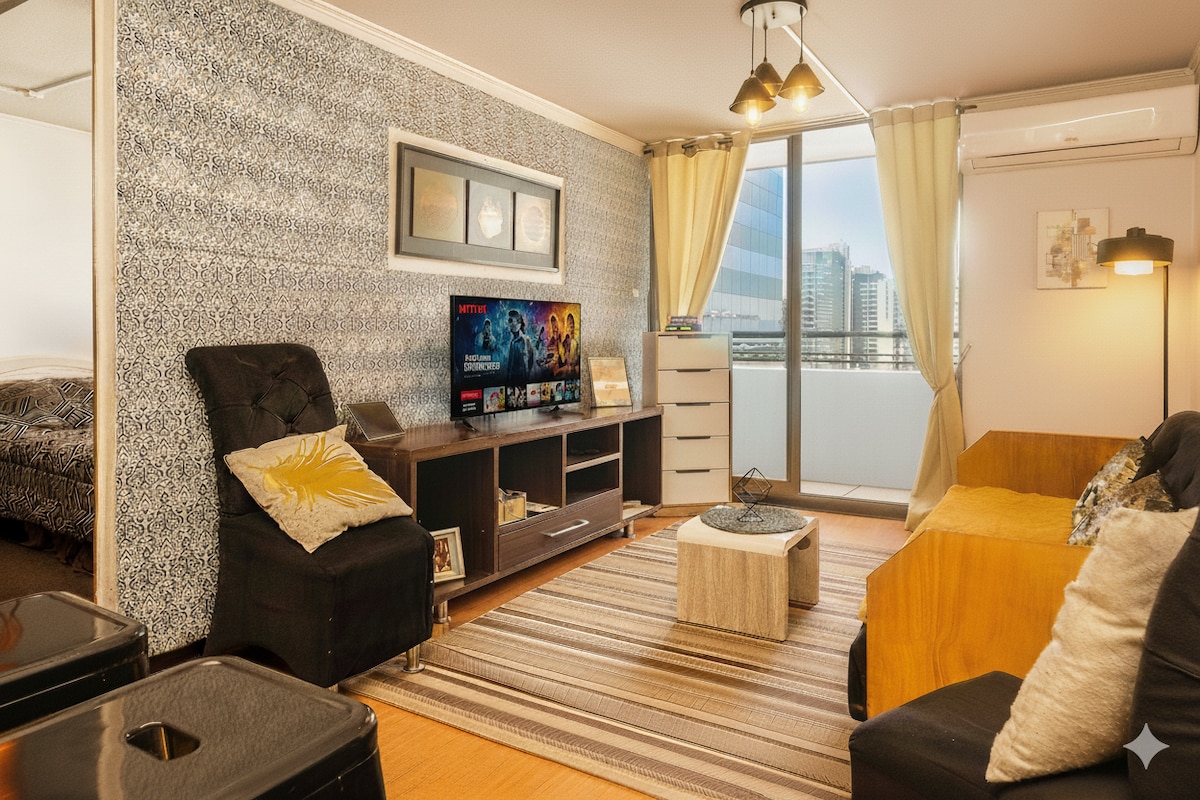 ✨ ¡Calificado con un 100% en Limpieza, Comunicación y Llegada por nuestros huéspedes! Disfruta de las vistas urbanas del corazón de Santiago desde este moderno y funcional apartamento de 2 habitaciones en el piso 14. Equipado para una estancia perfecta: • Aire Acondicionado • Wi-Fi de Fibra Óptica de alta velocidad • Smart TV con streaming Edificio seguro con conserje 24h para un check-in flexible y autónomo, además de custodia de equipaje GRATIS NOTA: ESTACIONAMIENTO SUJETO A DISPONIBILIDAD