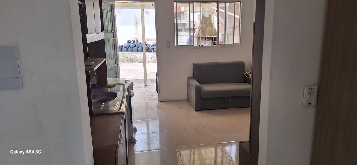 DESINFECTADO CON OZONO (elimina VIRUS, ácaros y olores) Propiedad tríplex en un barrio seguro y familiar. Calle tranquila, cerca de parques, hipermercados, foros, centros comerciales y farmacias. Cuenta con un televisor inteligente de 43 pulgadas, WiFi y aire acondicionado en la habitación. La residencia tiene 3 plantas, con la planta baja que consta de sala de estar y cocina. En la parte superior la casa tiene un dormitorio y un baño. En el tercer piso hay lavandería con lavadora, tanque y tendedero. Tiene un patio cerrado con un espacio cubierto.