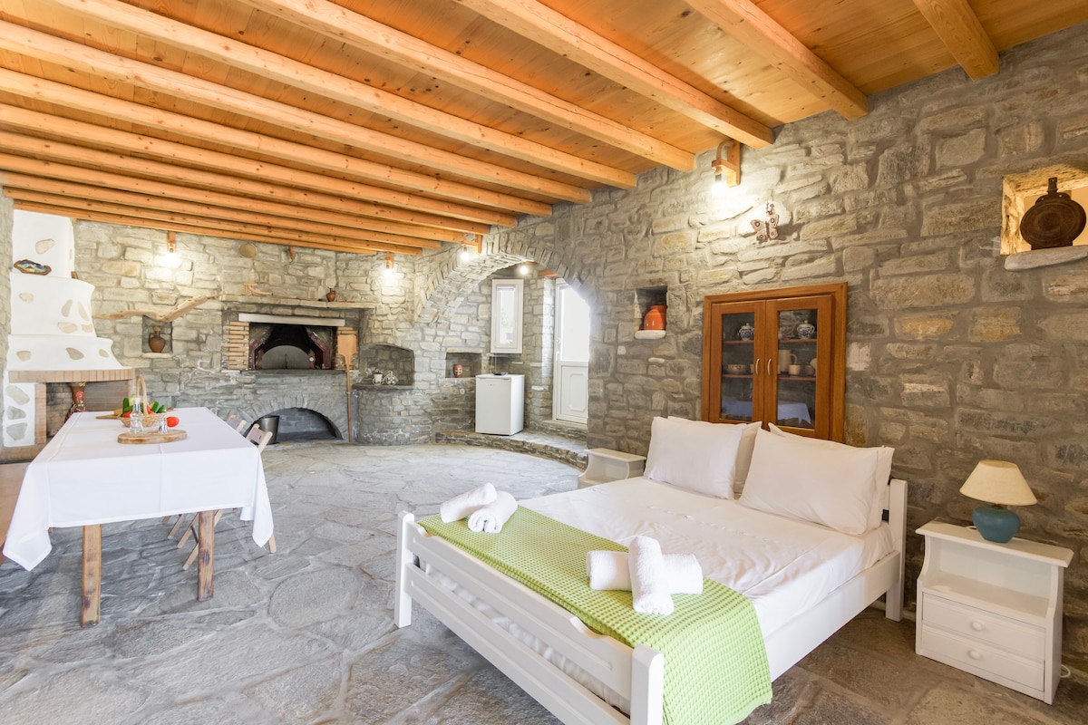 A spacious apartment made out of thick stone walls that contains a traditional wood-fired oven and a fireplace ( which are not for use by our guests). It's situated on the top of a small hill by Paroikia so you will have the opportunity to admire a unique view to the gulf of Paroikia and the sunset.