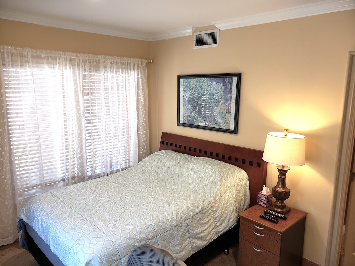 Rodeado de árboles y flores, este estudio totalmente privado es espacioso, luminoso y aireado. Una cama tamaño king y un sofá cama ofrecen un sueño reparador para 2 adultos y 1 niño. Hay mucho espacio para añadir cómodamente una cama para un segundo niño. (Lo hicimos varias veces en Navidad). Estamos fuera de una carretera privada, se siente como un viaje a una zona rural europea. Aún así, estamos a poca distancia en coche de negocios, centros comerciales, restaurantes, teatros y cerca de senderismo, ciclismo y paseos a caballo y playas. Baño privado.