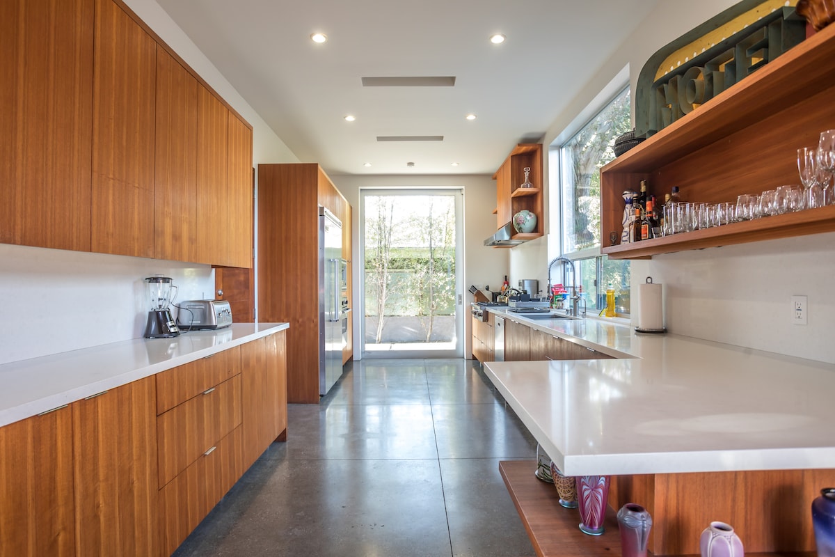 Moderna casa de mediados de siglo con 2 dormitorios/2 baños con vistas espectaculares sobre Sunset Strip (a 2 manzanas de Hollywood + Fairfax). A solo unas manzanas de la acción, pero muy privado y tranquilo. Renovaciones recientes desde el techo hasta los cimientos, sistema de calefacción/aire acondicionado, wifi de 1 Giga/seg, cableado de entrada y salida con 11 altavoces, proyector de cine + dos televisores 4k (Netflix gratuito, HBOMax y AppleTV+), estacionamiento para 2 coches con cargador eléctrico de nivel 2. Nota: No se permiten reuniones sociales ni noches ruidosas hasta tarde. Interior = 1015 pies cuadrados. Cubierta = 300 pies cuadrados.