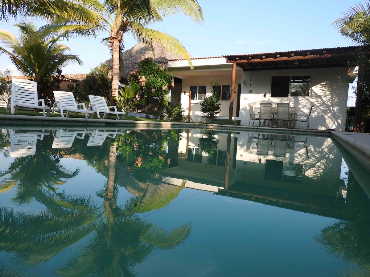 Casa de Playa frente al Mar, completamente privada. La casa cuenta con agua dulce se hizo cisterna para el efecto, y la piscina es de agua salada. Cocina completamente equipada con A/C. Dos habitaciones con A/C y baño privado cada una. Rancho de descanso con hamacas, salida peatonal a la playa, ideal para descansar, acompañado de amigos y familiares, Tranquilo y acogedor. Pensado para la privacidad de nuestros huéspedes. 3 parqueos privados adentro de la propiedad.