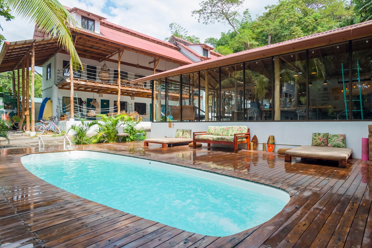 Disfrutarás de una bonita habitación privada con aire acondicionado, ventilador de techo, baño completo con agua caliente, caja fuerte e Internet. Point Break está en el corazón de Santa Teresa, en la calle principal, a pocos pasos de la playa, el mejor punto de surf de la ciudad, restaurantes, tiendas y mercados. Ofrecemos cocina totalmente equipada, parrilla para barbacoa, rancho con mesa de comedor, sala de estar en el patio y café gratis. Vibras relajadas + Excelente ubicación = ¡Vacaciones inolvidables!