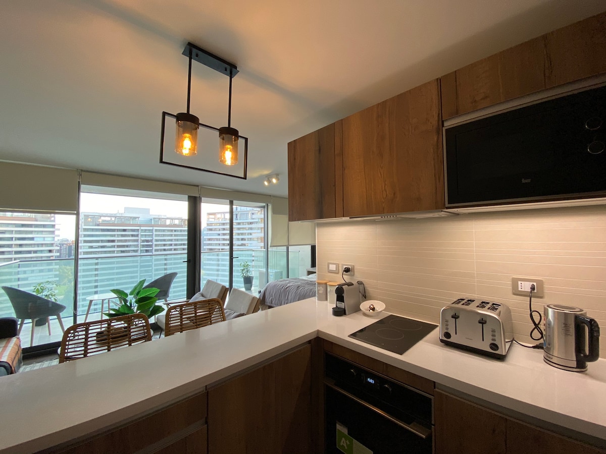 Beautiful and comfortable studio apartment steps away from Parque Arauco and Clínica Alemana. Enjoy a cozy and comfortable stay in Las Condes. Our Hosts are 1 click away! -Surrounded by cafes, restaurants and luxury shops -Comfortable King bed and 2-seater sofa bed -Kitchen fully equiped -High speed internet -Outdoor and indoor heated pool -Gym -Security and controlled access Ideal for: Business or pleasure People looking for a safe and quiet location