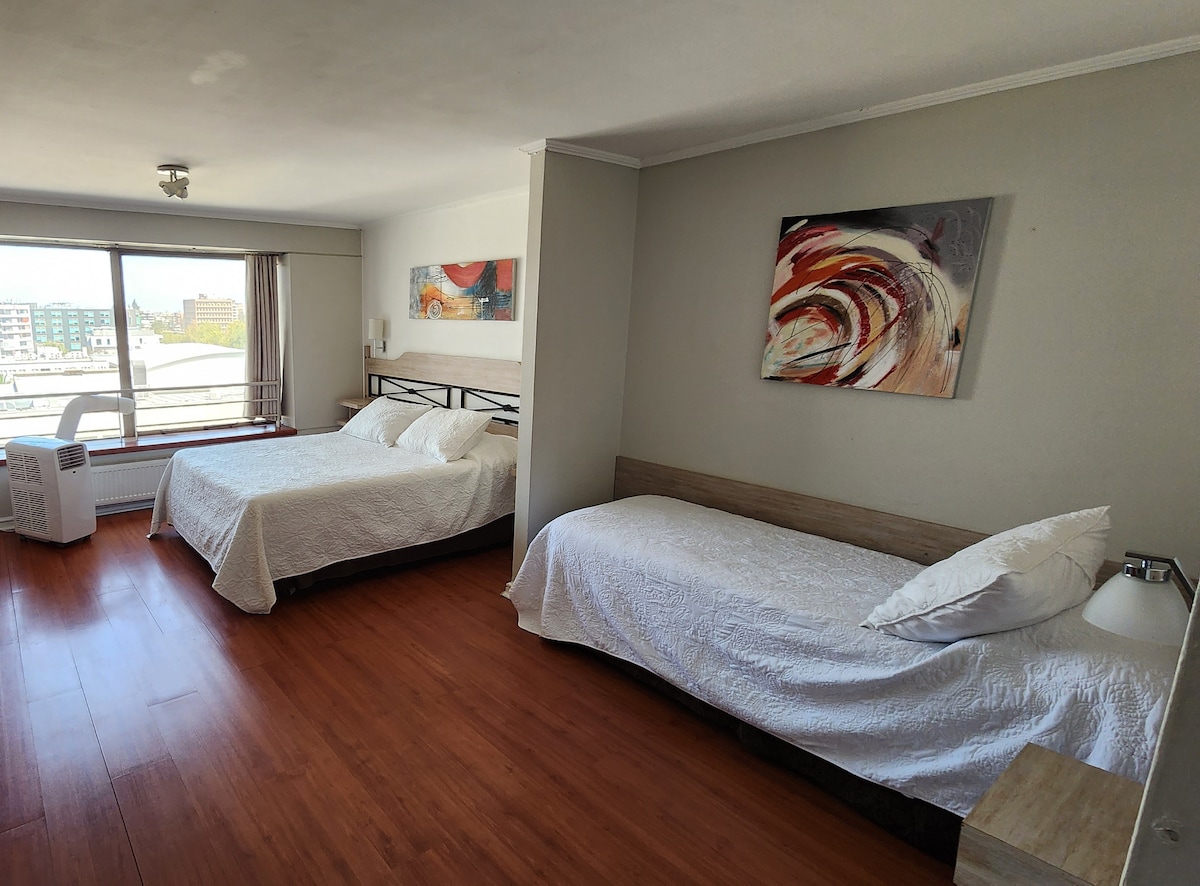 Luminoso departamento, bien equipado con piso flotante en living y dormitorio. El dormitorio tiene cama Box Spring de 2 plazas, impecables sabanas, tiene un Smart Tv led cuenta con Netflix , internet via wifi. La cocina cuenta con refrigerador, horno eléctrico, microondas, tostador, ollas y utensilios de cocina para cocinar. Tiene loza y cuchillería completa. Si esta mas de 6 noches dejo sabanas de recambio. El balcón cuenta con una terraza con mesa y 2 sillas.