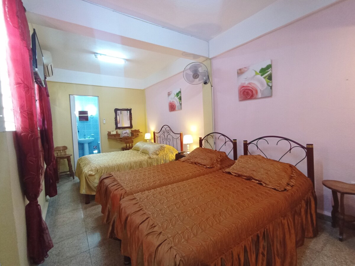 Habitación con entrada independiente y Wifi 24 horas en la 2da planta de nuestra casa con llave privada para los huéspedes, cuenta con 1 habitación para 3 personas con 2 camas, baño privado con agua caliente/fría, aire acondicionado, cocina, terraza privada al aire libre y cubierta de una mata de uva. Se encuentra en un barrio tranquilo de nuestra ciudad, frente al Teatro Heredia y a unos 200m de la Plaza de la Revolución, igualmente del Centro Comercial La Gran Piedra.