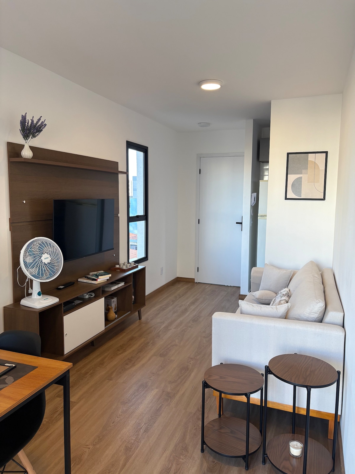 Apartahotel Aconchegante con vistas al atardecer. ¡Decoración encantadora, estructura completa y ubicación privilegiada! Tiene aire acondicionado, cafetera, freidora de aire, cama tamaño queen, 2 televisores inteligentes, canales por cable, cocina y sala de estar. Entorno de iluminación trifásico. Hay una lavandería de autoservicio, restaurante hotel, piscina, sauna y 1 plaza de aparcamiento cerca del carril bici, parque, restaurantes, farmacia, mercado, Kopenhagen, 4 km de compras São Caetano. Ideal para relajarse o trabajar con comodidad y seguridad.