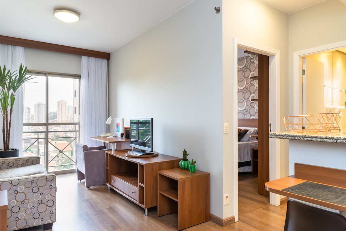 "Um flat completo, aconchegante. Localização privilegiada permitindo acesso - a pé - ao Centro Comercial, com suas charmosas lojas, cafeterias, empresas de decoração, farmácias, academias, bancos, locadoras, Shopping Center, clinicas, padarias e mercado. Em geral, o necessário para uma perfeita estadia. Internet 200 MB, 1 vaga de garagem, piscina que complementam sua estadia."