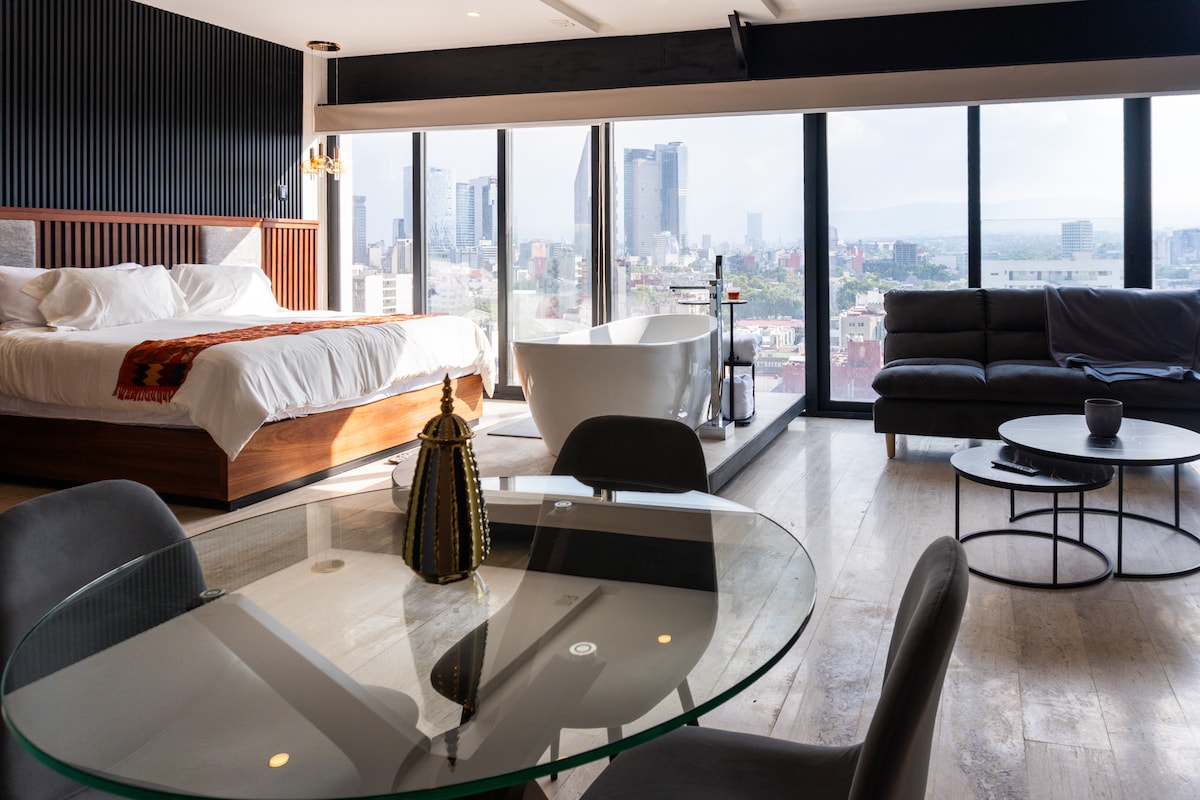 Loft con cama king, balcón y vistas al Parque México