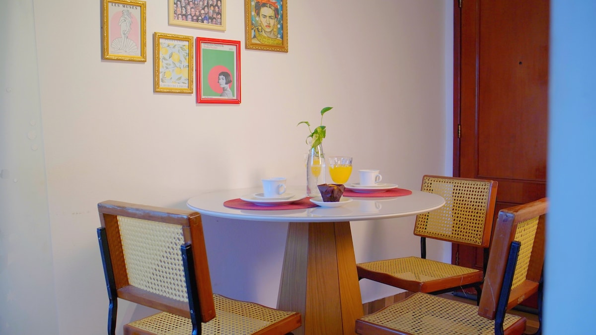 O ap conta com TV na sala, geladeira, cooktop, forno, depurador, utensílios de cozinha, camas de casal nos quartos, sofá cama de casal na sala, mesa de jantar com 4 cadeiras, roupas de cama e banho, cafeteira, chuveiros com água quente, ares condicionados nos quartos, ventilador na sala, internet de alta velocidade e água filtrada na torneira da cozinha (alguns itens são diferentes dos das fotos). O ap não conta com: lava e seca, TV no quarto, lava louças, microondas, cadeira de trabalho e PC.