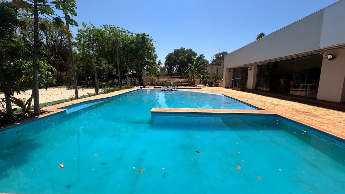 Refúgio natural onde você escuta só o canto dos pássaros, dentro da cidade, equilíbrio perfeito entre tranquilidade total e praticidade. Área de Lazer Completa para todos, Piscina Enorme, Quadra de Beach Tênis , Pomar Salão Amplo e Climatizado com cozinha completa, churrasqueira e bar para drinks, TV gigante, caixas de som potentes, mesa de ping pongue e muitas mesas e cadeiras, Banheiros feminino e masculino Chalé com três suítes com ar-condicionado, separadas do salão.