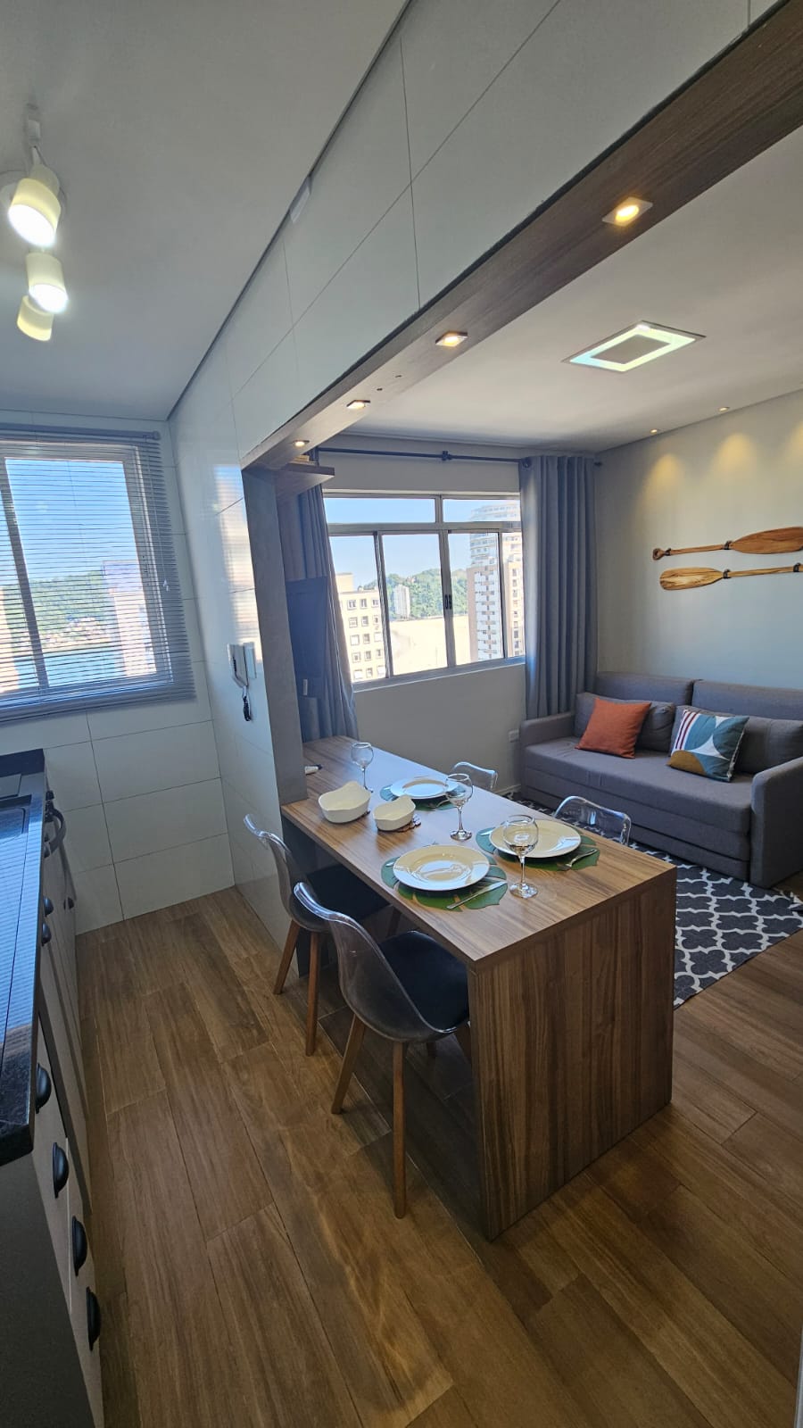 Apartamento moderno em São Vicente, com 1 garagem, a poucos passos da Praia do Gonzaguinha e da principal avenida da cidade. Totalmente equipado, com wi-fi, ar cond. nos quartos, ventiladores e secador de cabelo. Necessário trazer roupas de cama e banho. O Condomínio oferece portaria 24h, elevadores social e de serviço e para o retorno da praia entrada lateral com torneiras disponíveis para lavar os pés. Além de espaço kids e salão de jogos. Próximo ao Shoping, McDonald's e principais comércios.