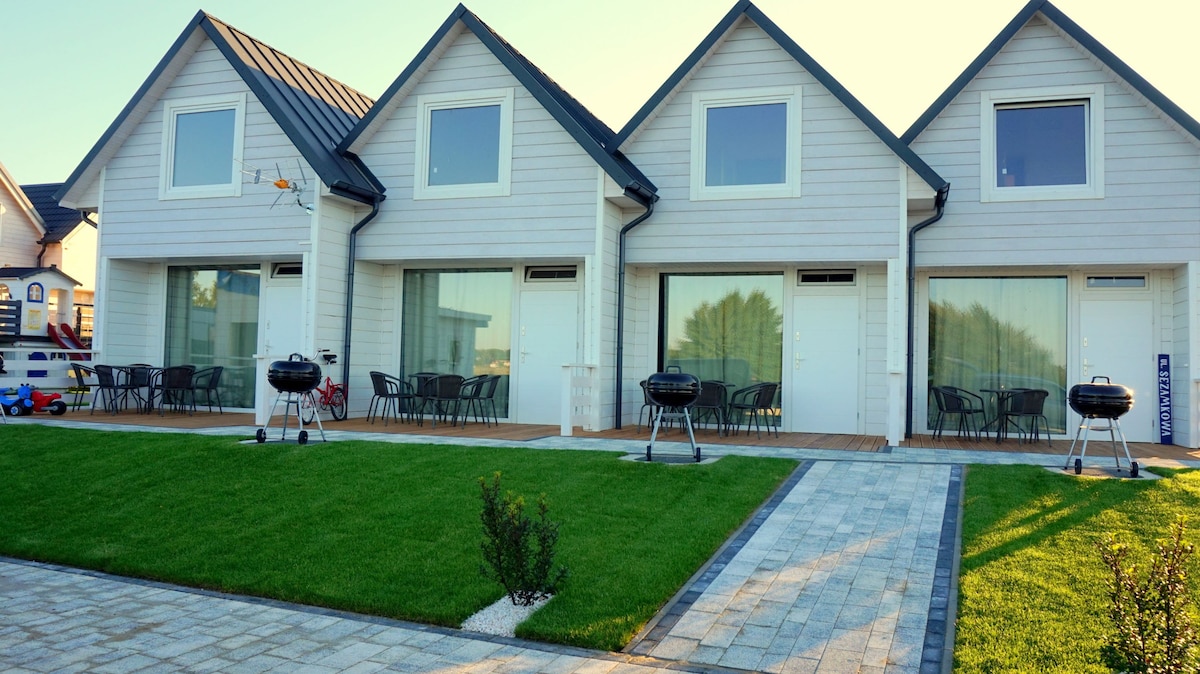 Cómoda casa de 74 metros cuadrados con zona de SPA privada (jacuzzi y sauna seca, exclusiva, sin cargos adicionales). Una parcela vallada te da la sensación de tener tu propio espacio y privacidad. 2 dormitorios (cada dormitorio tiene una cama de 160x200 cm y un sofá cama de 120x190 cm). La ventana panorámica de uno de los dormitorios ofrece una hermosa vista. El patio tiene una parrilla de gas, una mesa grande y 6 sillas, y una cómoda mecedora. Tumbonas y pantalla de playa. Dos plazas de estacionamiento.