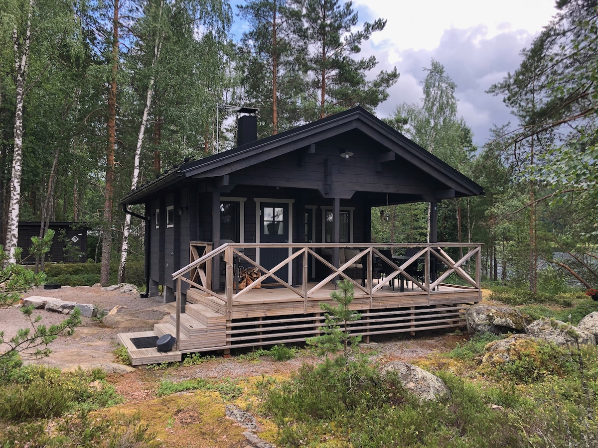 Una casa de campo pavimentada con un impresionante acantilado en medio de la naturaleza, a orillas de un lago Elijärvi. Desde las ventanas y la terraza de la sala de estar, una vista al lago se abre a sus magníficas puestas de sol. La cabaña tiene todas las comodidades básicas; electricidad, agua corriente, aire acondicionado, una cocina moderna cocina, una ducha, una sauna de leña, una parrilla de gas, una gran terraza y un bote de remos privado. Casa de campo de madera tradicional con todas las comodidades básicas junto al lago Elijärvi. Hermosa vista al lago desde la sala de estar y la terraza con impresionantes puestas de sol.