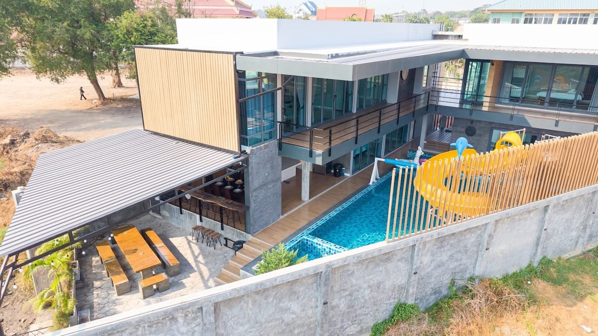 Furgoneta de traslado gratuito desde el aeropuerto - Casa de alojamiento รองรับได้ 25-30 ท่าน ใกล้หาดจอมเทียน 1 นาที🏡 T2 House Pattaya🏡 - 9 dormitorios, 7 baños. - Piscina corrediza: hay mucho espacio además de la piscina. - Televisión de 55 pulgadas - Karaoke - Mesa de billar - Mesa de barbacoa - Seguridad las 24 horas. Se aplica jabón/champú. - Wifi gratuito: acceso fácil a tiendas y mercados convenientes. 🎯Lugares cercanos 7️ư 7 eleven 500 m Playa 🌴Jomtien a 1 km. Supermercado 🟣 Makro a 6 km. 🟢 Caminando por la calle a 10 minutos. Centro 🏙️ de la ciudad a 10 minutos