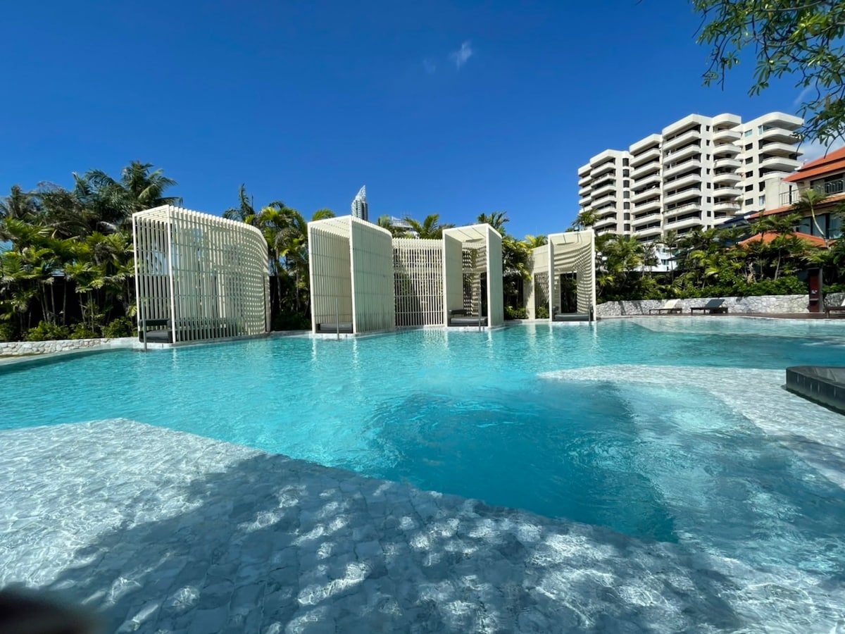 Esta habitación de acceso a la piscina, puedes bucear en la piscina directamente desde la habitación. Habitación - 1 cama tamaño king size (6 pies), 1 SOFÁ CAMA (4,5 pies). - Cocina integrada con campana y cocina electrónica. - refrigerador, microondas, hervidor de agua - Piscinas con estilo parque acuático con 2 toboganes. - ola artificial (solo para fines de semana). - Piscinas de terapia en interiores: enorme gimnasio, sala de yoga, sala de boxeo. - Sala de juegos - Club infantil - Acceso a la playa